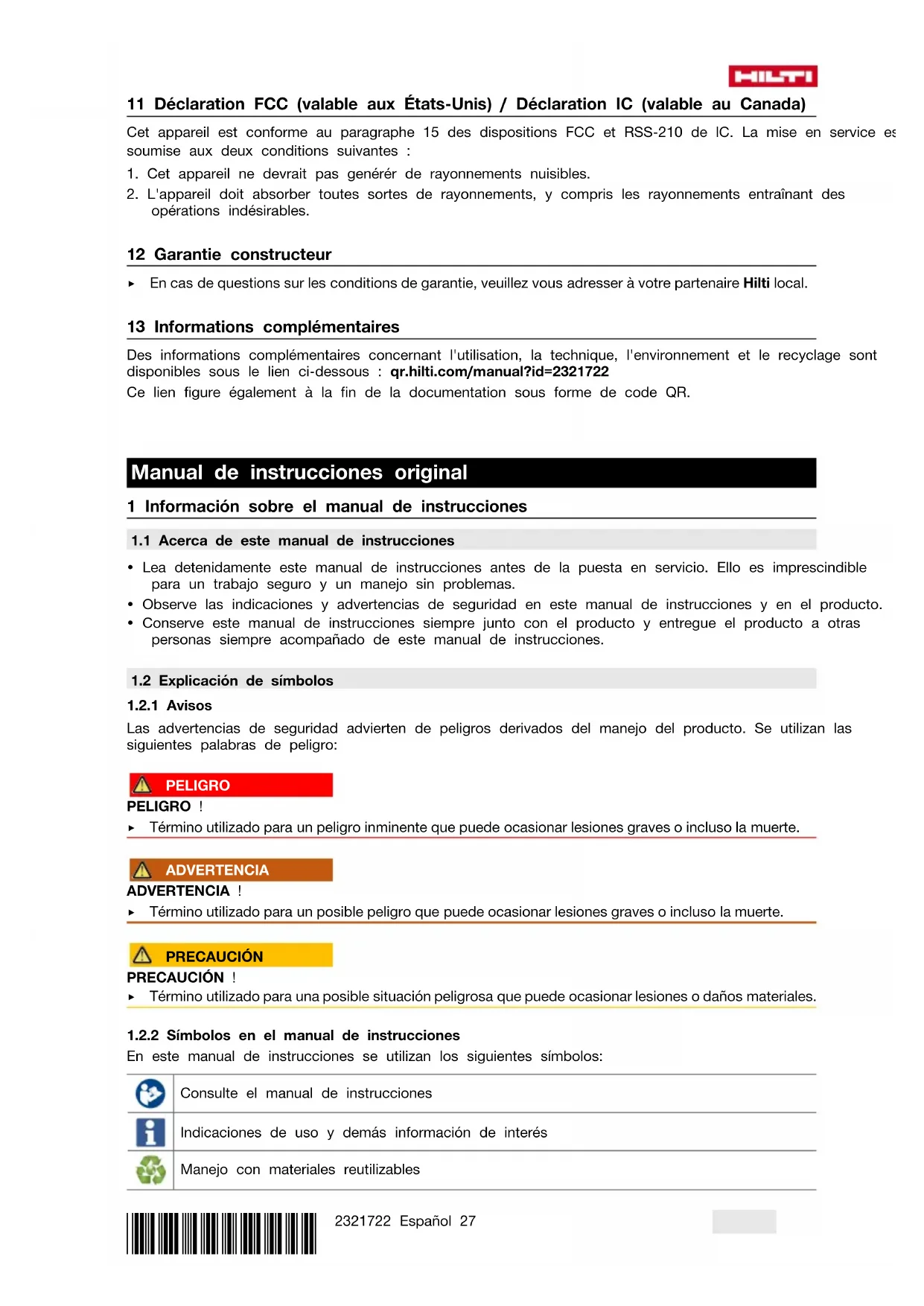 deseadas. 12 Garantía del fabricante ▶ Si tiene alguna consulta acerca de las condiciones de la garantía, póngase en contacto con su sucursal local de Hilti. 13 Más información Encontrará información adicional sobre manejo, técnica, medio ambiente y reciclaje en el siguiente enlace: qr.hilti.com/manual?id=2321722 Encontrará este enlace también al final de la documentación como código QR.*2321722* 2321722 Português 41 Manual de instruções original 1 Indicações sobre o Manual de instruções