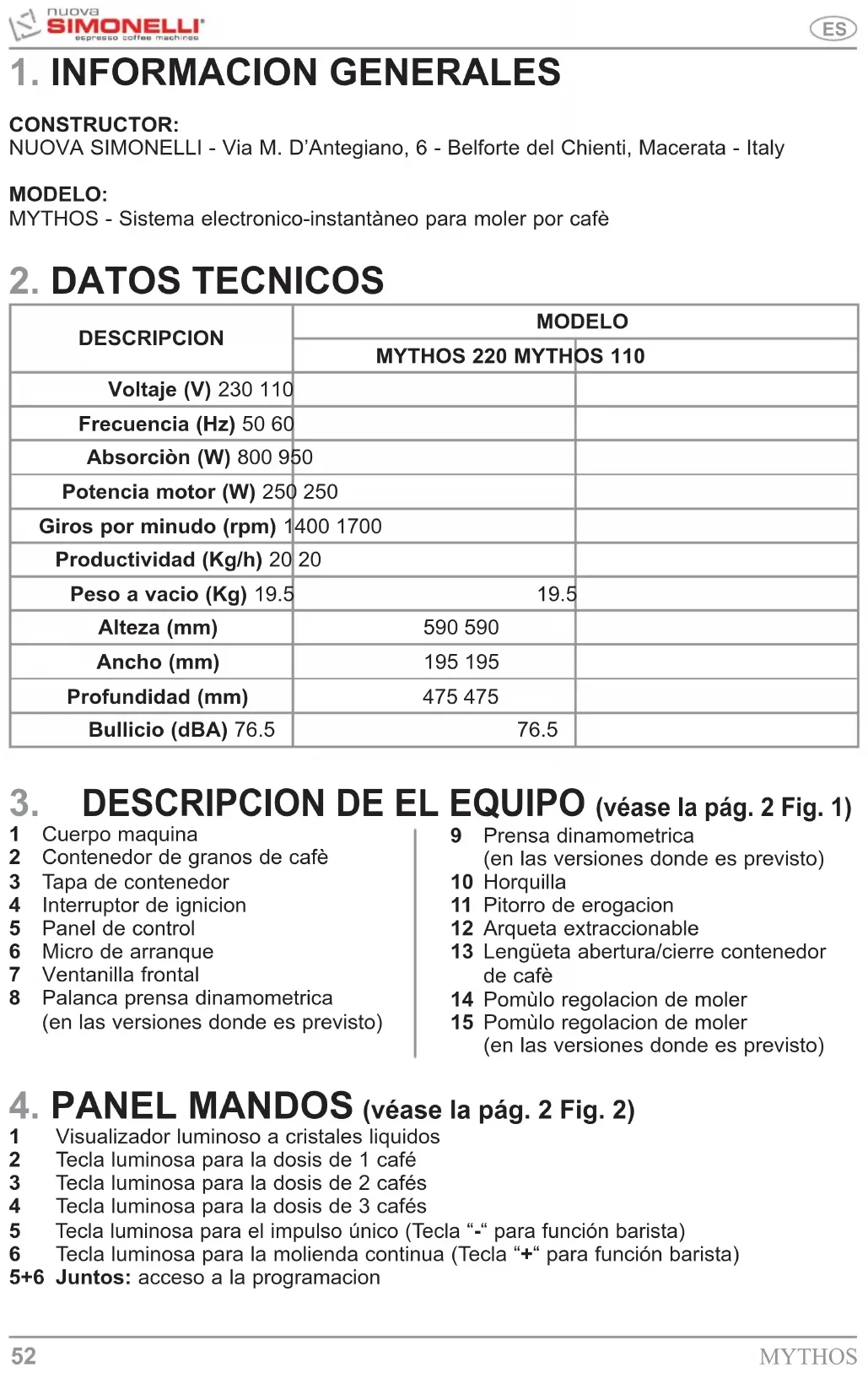 MANUAL DE USUARIO Mythos 1 NUOVA SIMONELLI