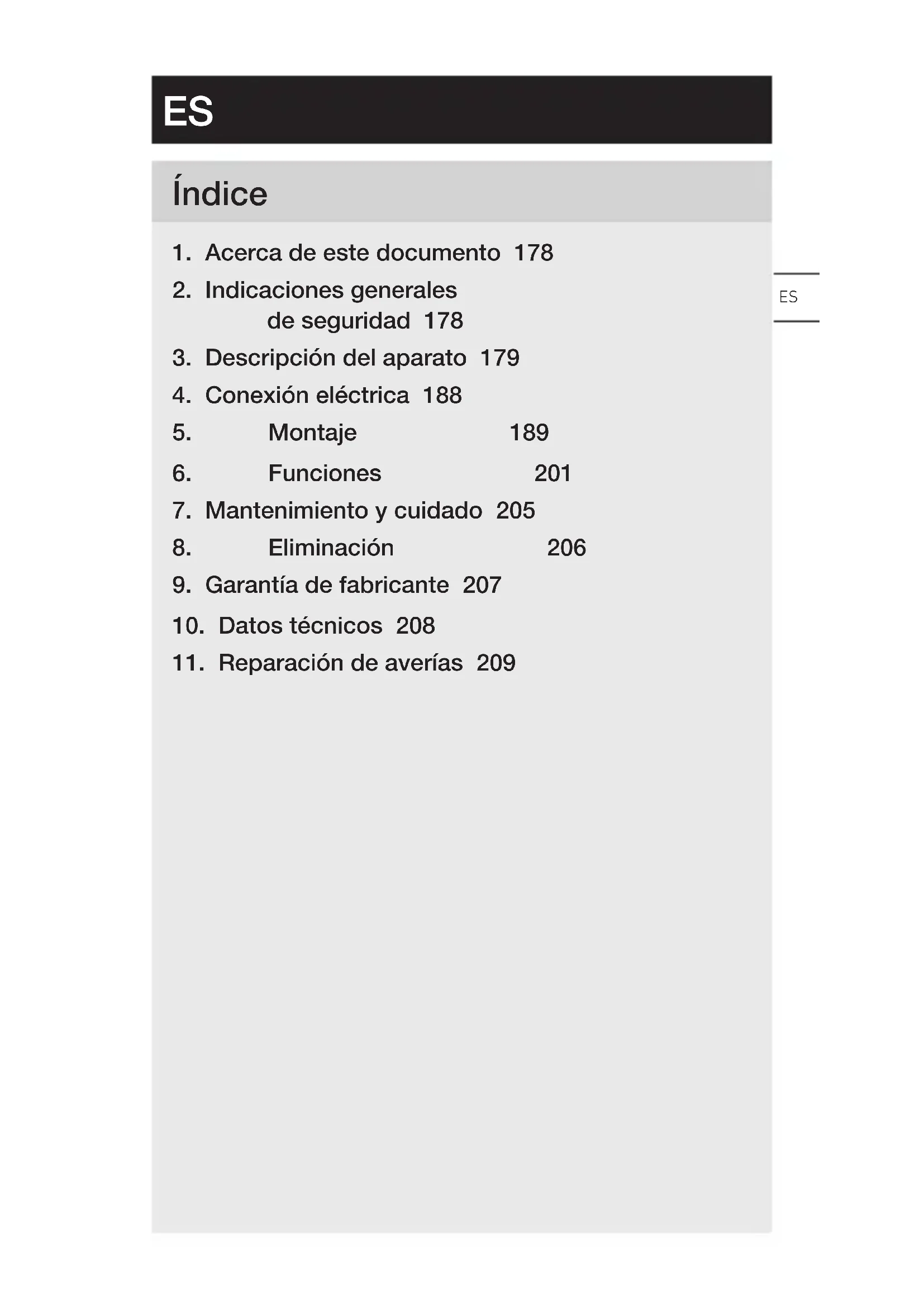 Aparatos eléctricos, accesorios y embalajes han de some- terse a un reciclaje respetuoso con el medio ambiente. ¡No eche los aparatos eléctricos a la basura doméstica! Solo para países de la UE: Según la Directiva europea vigente sobre residuos de aparatos eléctricos y electrónicos y su transposición al derecho nacional, aparatos eléctricos fuera de uso deben recogerse por separado y someterse a un reciclaje respe- tuoso con el medio ambiente.ES – 207 – Índice