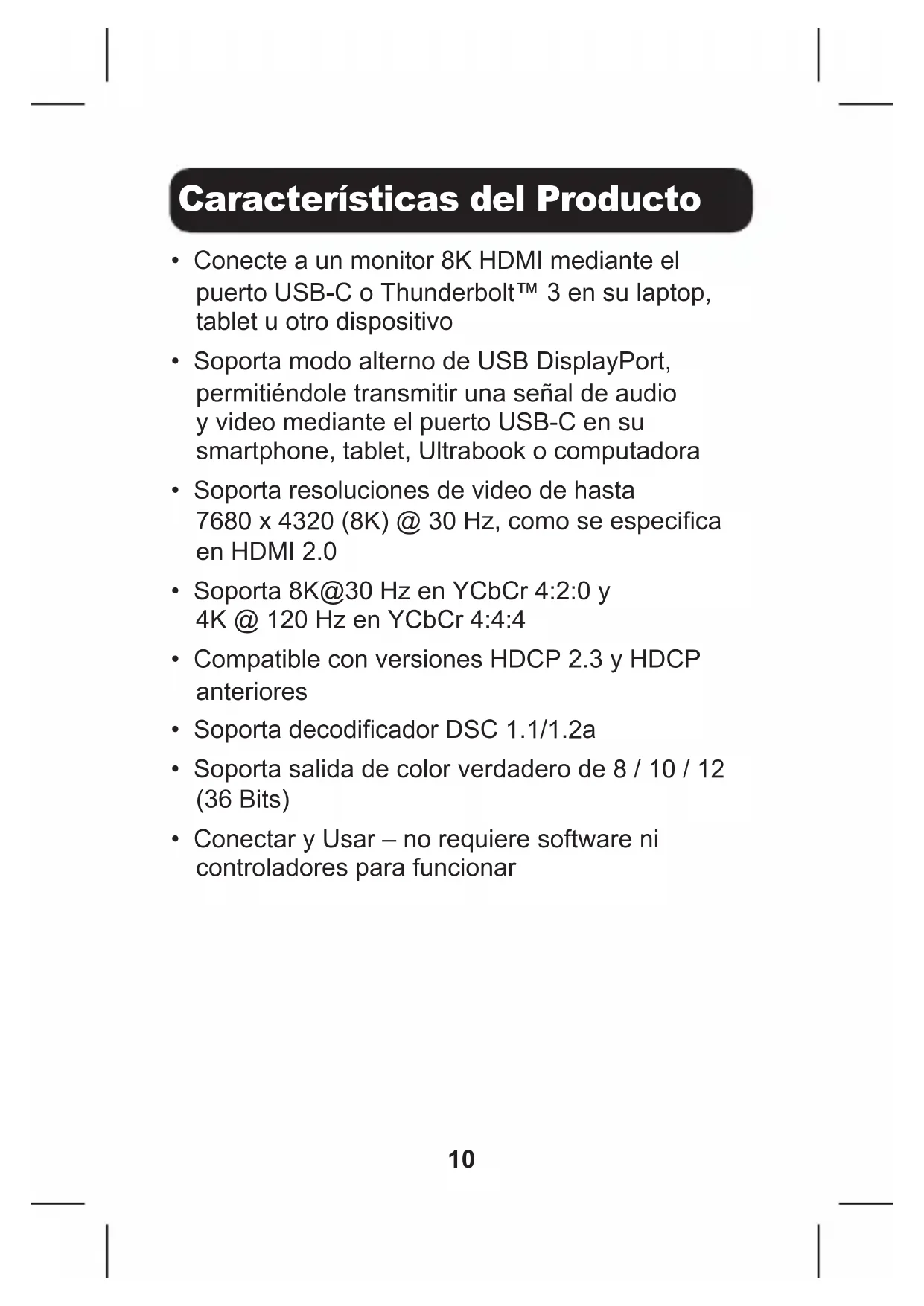 adicional. Personalice la forma cómo se muestra el video utilizando la conguración de pantalla de su dispositivo. Instalación13 Especicaciones Conectores Entrada USB Tipo C (Macho) Salida HDMI (Hembra) Video Máxima Resolución 7680 x 4320 @ 30 Hz (8K) HDCP 2.3 Color Verdadero 8 / 10 / 12 bits (36 bits) Formato en Pixeles RGB/YCbCr 4:4:4, YCbCr 4:2:2, YCbCr 4:2:0 DSC DSC 1.1/1.2a HDR HDR10+ Ambiental Rango de Temperatura de Operación 0 °C a 45 °C [32 °F a 113 °F] Rango de Temperatura de Almacenamiento -10 ºC a 70 ºC [14 ºF a 158 ºF] Rango de Humedad Relativa De 10% A 90% de HR Alimentación Alimentado por Bus Físicas Longitud del Cable 110 mm [4.33"] Dimensiones de la Unidad [Al x An x Pr]
