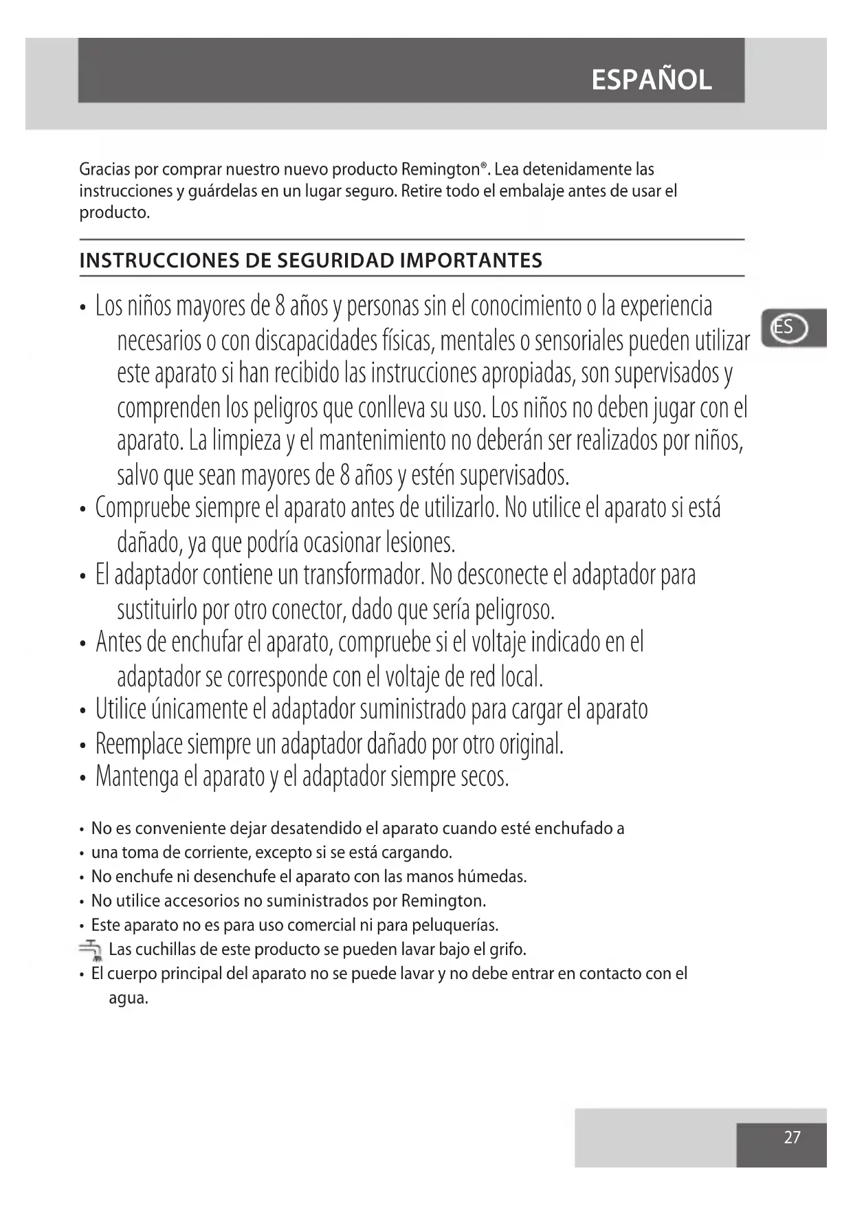 Gracias por comprar nuestro nuevo producto Remington. Lea detenidamente las instrucciones y guardelas en un lugar seguro. Retire todo el embalaje antes de usar el producto.
