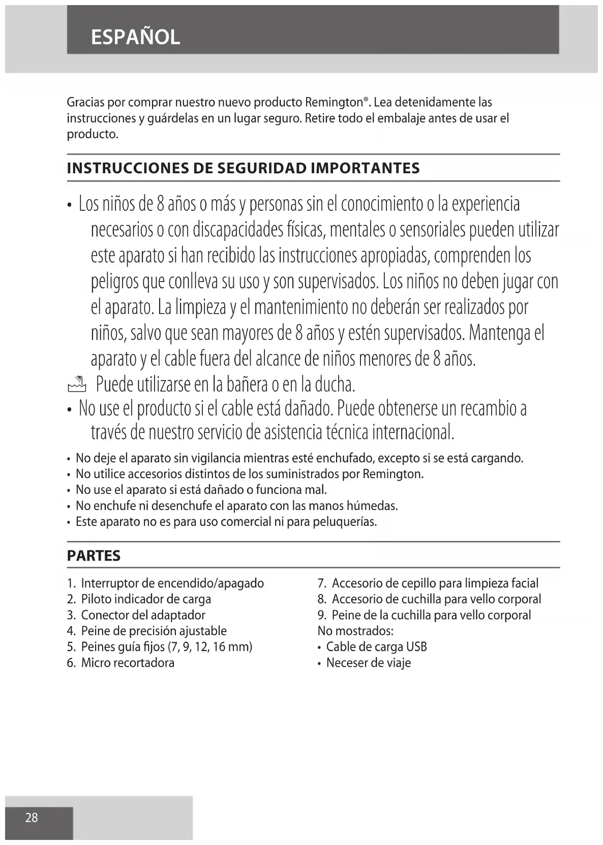 AE28 ESPAÑOL Gracias por comprar nuestro nuevo producto Remington®. Lea detenidamente las instrucciones y guárdelas en un lugar seguro. Retire todo el embalaje antes de usar el producto.