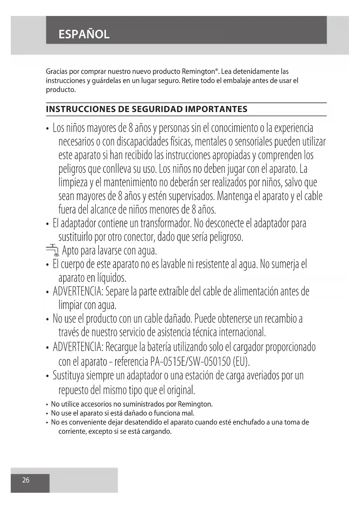 AE26 Gracias por comprar nuestro nuevo producto Remington®. Lea detenidamente las instrucciones y guárdelas en un lugar seguro. Retire todo el embalaje antes de usar el producto.