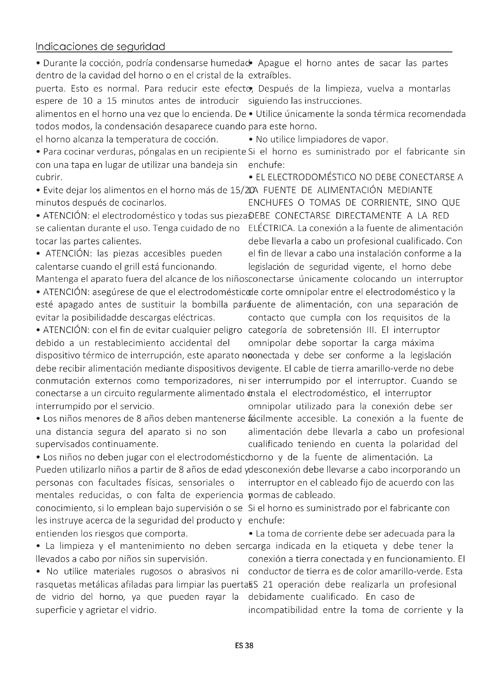 - La toma de corriente debe ser adecuada para la carga indicada en la etiqueta y debe tener la conexión a tierra conectada y en funcionamiento. El conductor de tierra es de color amarillo-verde. Esta ES 21 operación debe realizarla un profesional debidamente cualificado. En caso de incompatibilidad entre la toma de corriente y la ES 38• Si el cable de alimentación está dañado, debe sustituirse por un cable o un haz de cables especial comercializado por el fabricante; también puede ponerse en contacto con el departamento de atención al cliente.