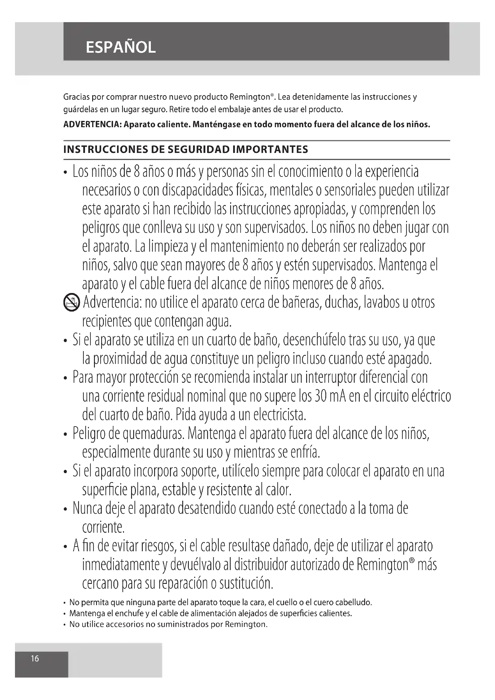 AE16 Gracias por comprar nuestro nuevo producto Remington®. Lea detenidamente las instrucciones y guárdelas en un lugar seguro. Retire todo el embalaje antes de usar el producto. ADVERTENCIA: Aparato caliente. Manténgase en todo momento fuera del alcance de los niños.