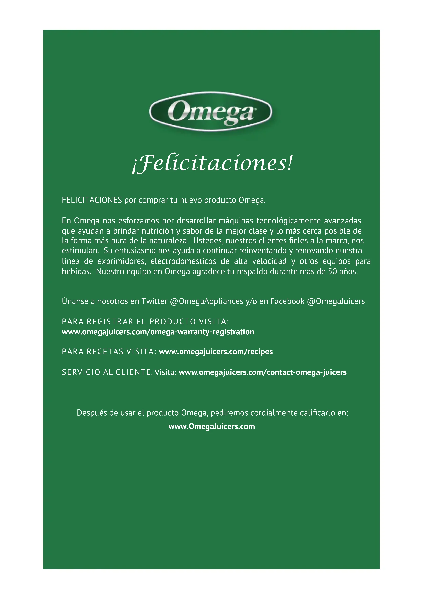 - Si cae aceite vegetal o animal en la barrena o la criba para jugo, el desempeño del extractor de jugo puede ser afectado y pueden dañarse las piezas. CONTÁCTANOS: En línea: www.OmegaJuicers.com/contact-omega-juicers76 ESPECIFICACIONES Denominación del modelo Serie MMV700 Voltaje nominal 120 V Frecuencia nominal 60 Hz A 2 Motor 240 W Peso 14.77 lb (6.7 kg) Dimensiones del producto 8.5” (217 mm) de ancho Profundidad: 6.37” (162 mm) Altura: 18.5” (469 mm) También disponible en versión internacional 220 V / 50-60 Hz MMV70277 NOTASDiscover the complete line of Omega brand professional products at: Découvrez la ligne complète de produits professionnels de la marque Omega sur : Descubre la línea completa de productos profesionales de la marca Omega en: www.OmegaJuicers.com Nourish Your Body Enrich Your Soul Alimentez votre corps Enrichissez votre âme Nutre tu cuerpo Enriquece tu alma