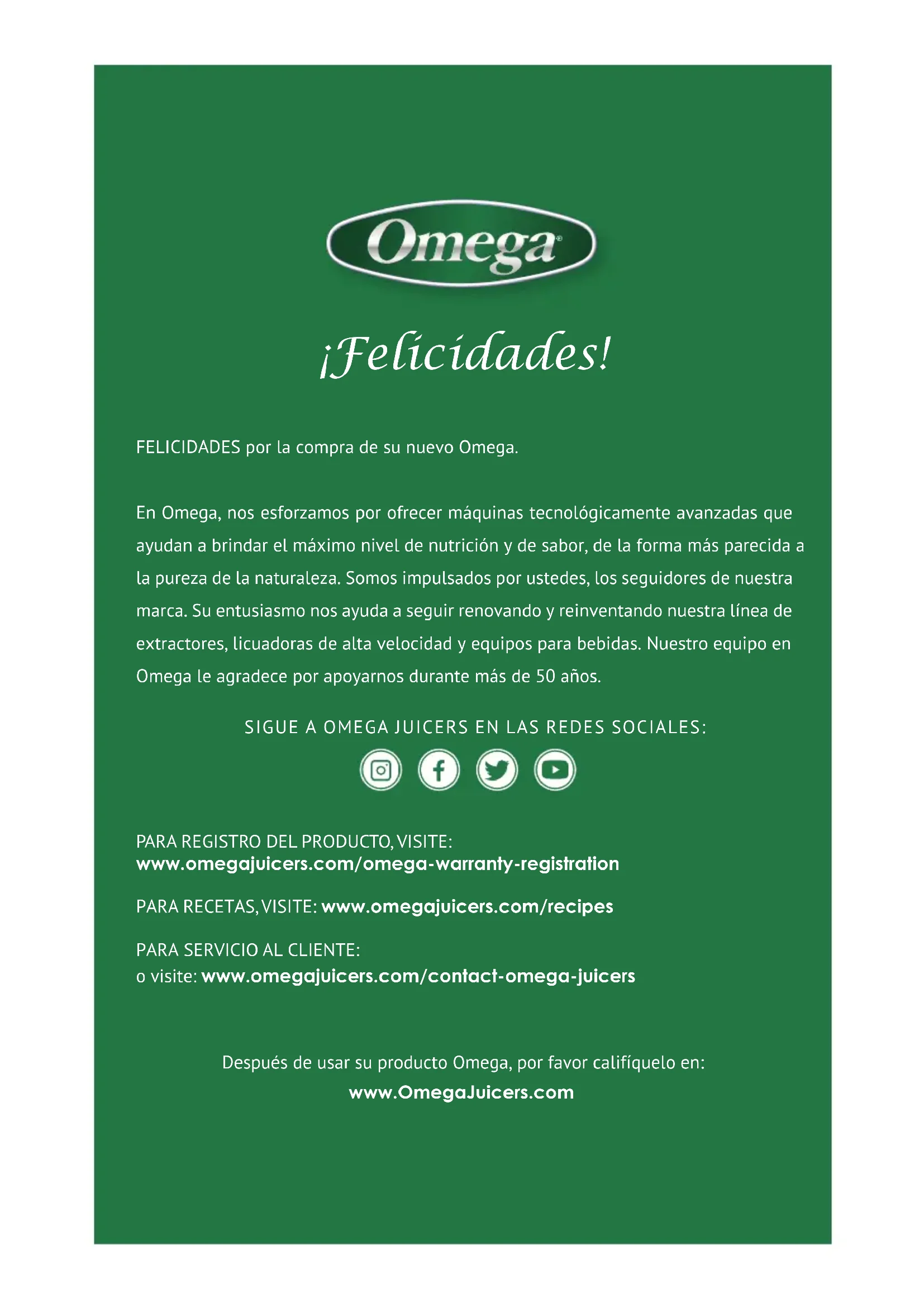 Enchufa en tomacorriente con conexión a tierra. No quites la clavija de conexión a tierra. No uses adaptadores. No uses cables de extensión. Incumplir estas instrucciones puede resultar en muerte, incendio o descarga eléctrica. ADVERTENCIA ¡PARTES MÓVILES! Cubre siempre la tapa del recipiente al licuar. No pongas las manos, cucharas ni otros utensilios en el recipiente al licuar. Incumplir estas instrucciones puede resultar en fracturas de huesos, cortadas y otras lesiones. IGNORAR ESTAS ADVERTENCIAS PUEDE RESULTAR EN INCENDIO, LESIONES GRAVES, DESCARGA ELÉCTRICA Y/O MUERTE CONTÁCTENOS: En línea: www.OmegaJuicers.com/contact-omega-juicersDISPOSICIONES DE SEGURIDAD IMPORTANTESAl usar equipos eléctricos deben seguirse siempre las precauciones básicas de seguridad, incluyendo las siguientes: