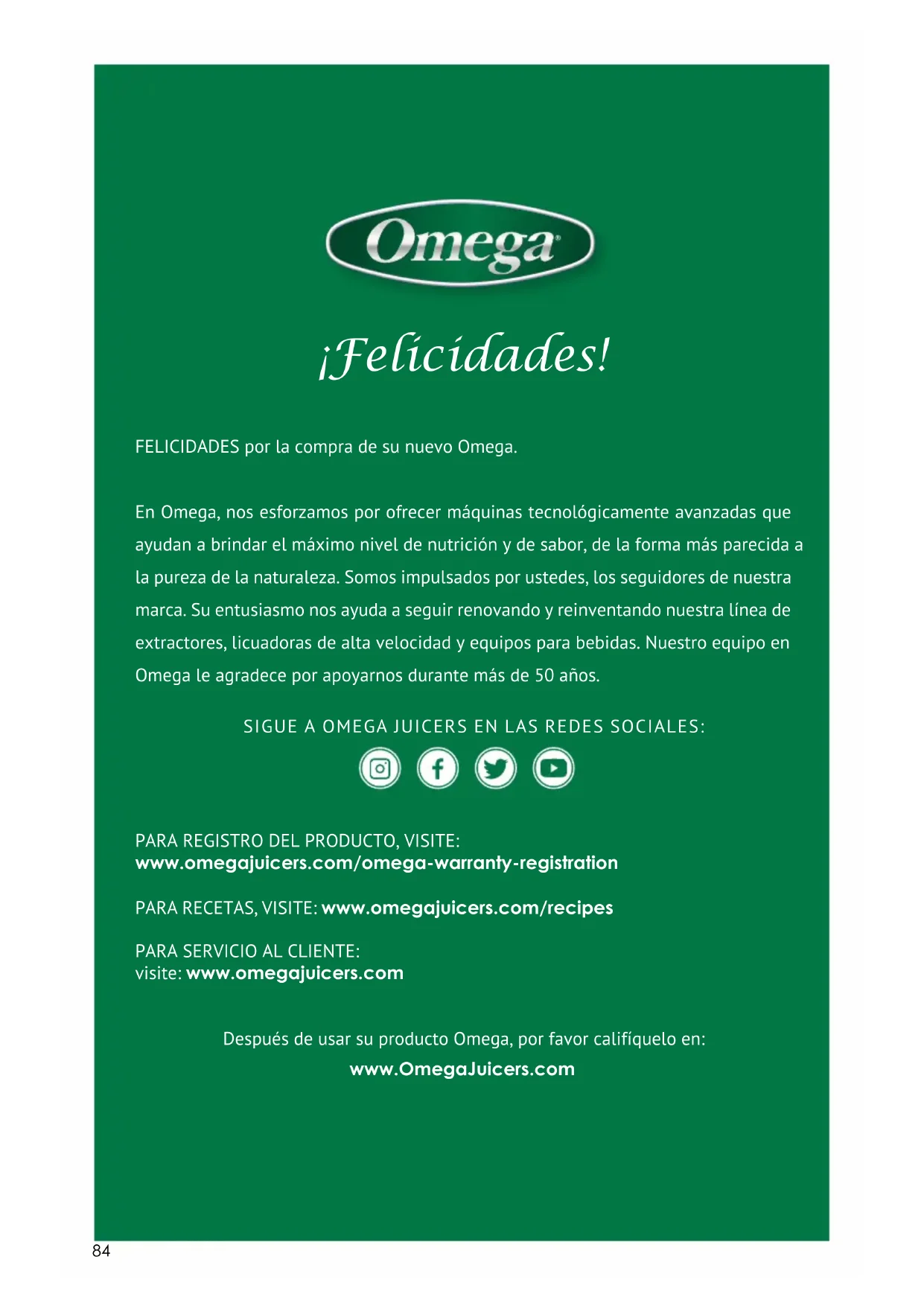 4 oranges/mandarines surgelées et pelées 1 tasse de yogourt à la vanille RECETTES¡Felicidades! FELICIDADES por la compra de su nuevo Omega. En Omega, nos esforzamos por ofrecer máquinas tecnológicamente avanzadas que ayudan a brindar el máximo nivel de nutrición y de sabor, de la forma más parecida a la pureza de la naturaleza. Somos impulsados por ustedes, los seguidores de nuestra marca. Su entusiasmo nos ayuda a seguir renovando y reinventando nuestra línea de extractores, licuadoras de alta velocidad y equipos para bebidas. Nuestro equipo en Omega le agradece por apoyarnos durante más de 50 años. PARA REGISTRO DEL PRODUCTO, VISITE: www.omegajuicers.com/omega-warranty-registration PARA RECETAS, VISITE: www.omegajuicers.com/recipes PARA SERVICIO AL CLIENTE: visite: www.omegajuicers.com Después de usar su producto Omega, por favor califíquelo en: www.OmegaJuicers.com