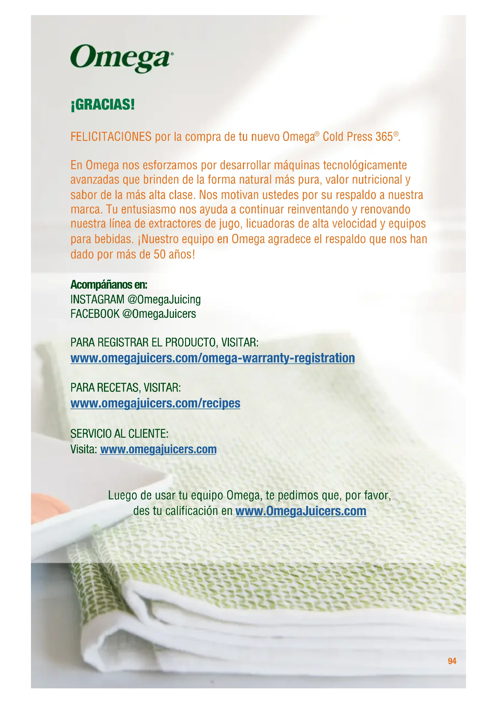 En Omega nos esforzamos por desarrollar máquinas tecnológicamente avanzadas que brinden de la forma natural más pura, valor nutricional y sabor de la más alta clase. Nos motivan ustedes por su respaldo a nuestra marca. Tu entusiasmo nos ayuda a continuar reinventando y renovando nuestra línea de extractores de jugo, licuadoras de alta velocidad y equipos para bebidas. ¡Nuestro equipo en Omega agradece el respaldo que nos han dado por más de 50 años! Acompáñanos en: INSTAGRAM @OmegaJuicing FACEBOOK @OmegaJuicers PARA REGISTRAR EL PRODUCTO, VISITAR: www.omegajuicers.com/omega-warranty-registration PARA RECETAS, VISITAR: www.omegajuicers.com/recipes SERVICIO AL CLIENTE: Visita: www.omegajuicers.com Luego de usar tu equipo Omega, te pedimos que, por favor, des tu calificación en www.OmegaJuicers.com95