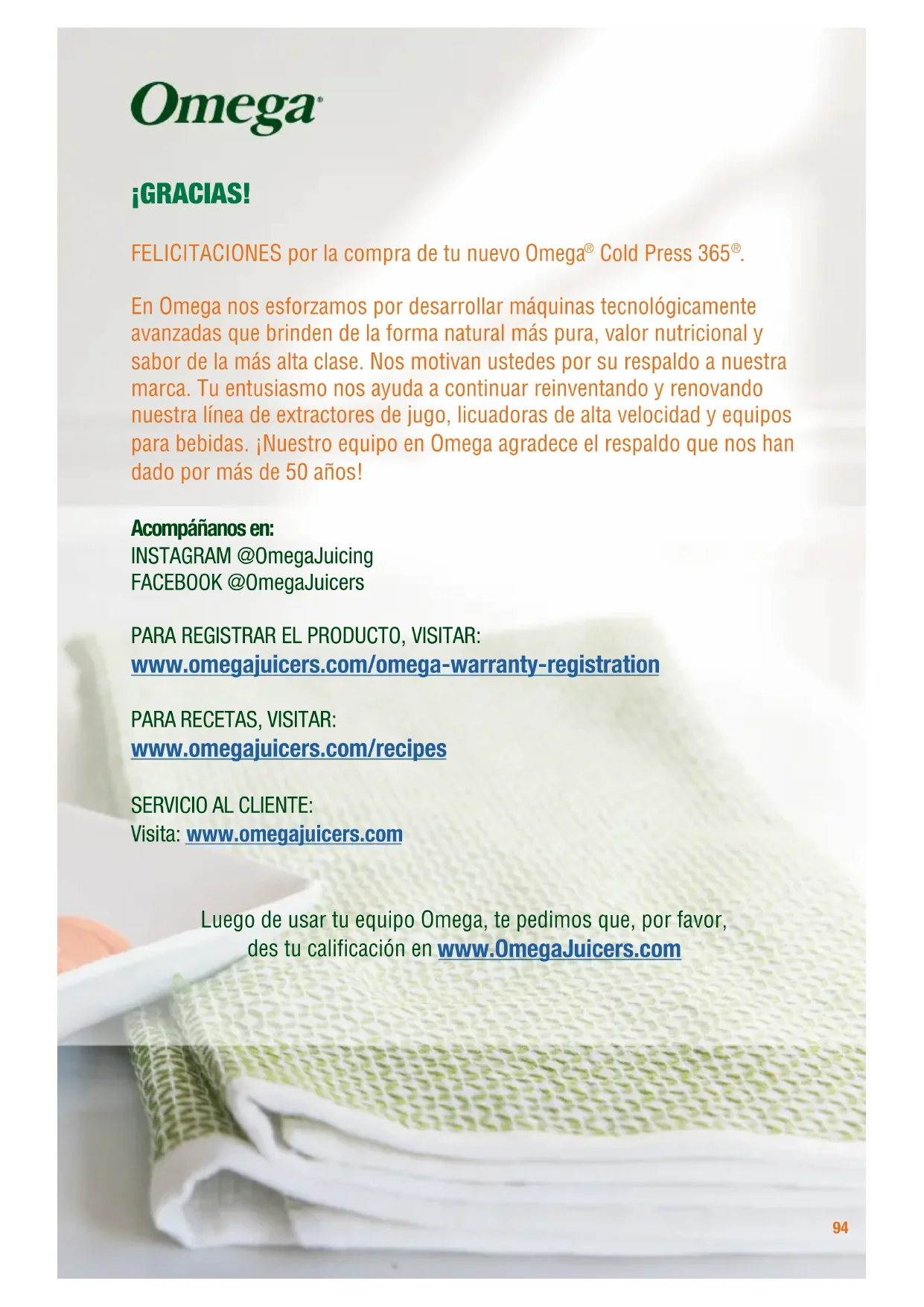 FELICITACIONES por la compra de tu nuevo Omega® Cold Press 365®.
