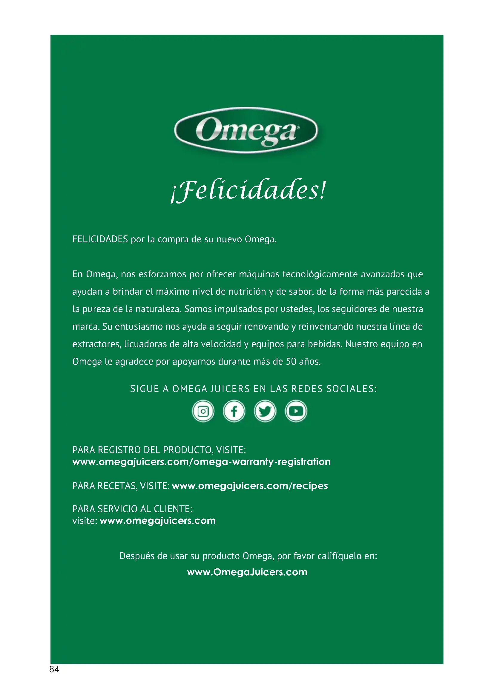 PARA REGISTRO DEL PRODUCTO, VISITE: www.omegajuicers.com/omega-warranty-registration