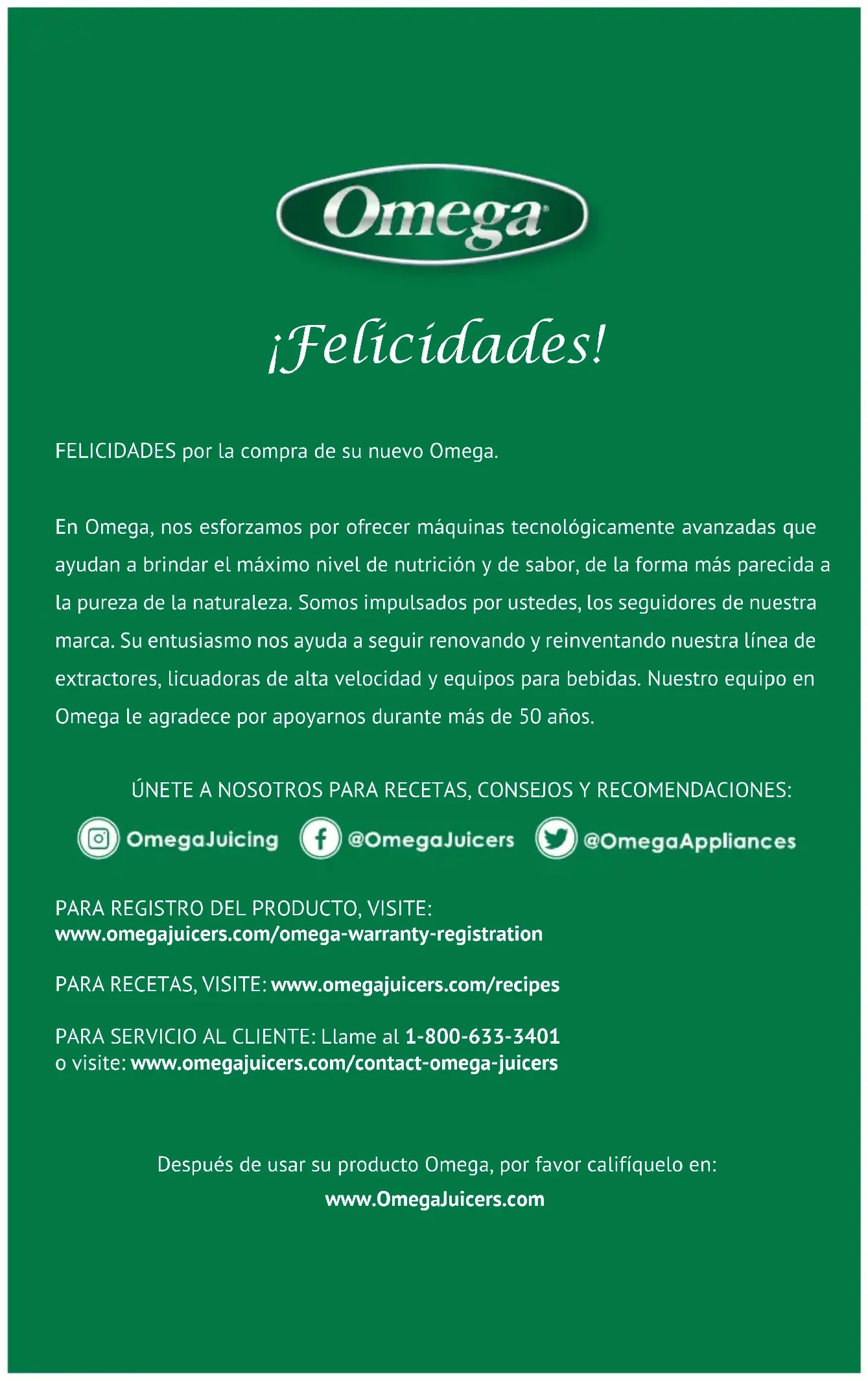 4 oranges/mandarines surgelées et pelées 1 tasse de yogourt à la vanille RECETTES¡Felicidades! FELICIDADES por la compra de su nuevo Omega. En Omega, nos esforzamos por ofrecer máquinas tecnológicamente avanzadas que ayudan a brindar el máximo nivel de nutrición y de sabor, de la forma más parecida a la pureza de la naturaleza. Somos impulsados por ustedes, los seguidores de nuestra marca. Su entusiasmo nos ayuda a seguir renovando y reinventando nuestra línea de extractores, licuadoras de alta velocidad y equipos para bebidas. Nuestro equipo en Omega le agradece por apoyarnos durante más de 50 años. PARA REGISTRO DEL PRODUCTO, VISITE: www.omegajuicers.com/omega-warranty-registration PARA RECETAS, VISITE: www.omegajuicers.com/recipes PARA SERVICIO AL CLIENTE: Llame al 1-800-633-3401 o visite: www.omegajuicers.com/contact-omega-juicers Después de usar su producto Omega, por favor califíquelo en: www.OmegaJuicers.com ÚNETE A NOSOTROS PARA RECETAS, CONSEJOS Y RECOMENDACIONES:ÍNDICE