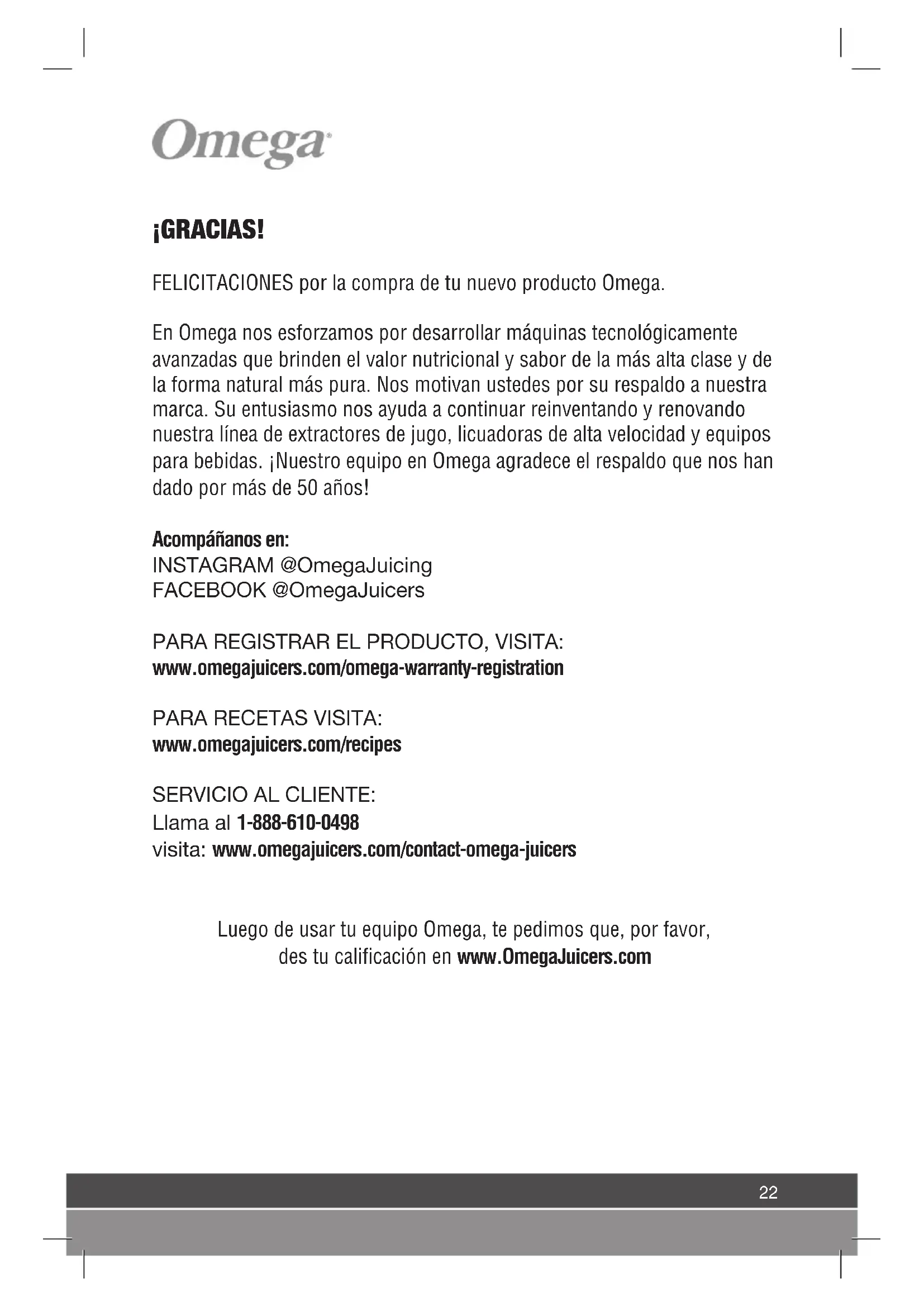 MOINS FORT DÉPANNAGE 1-888-610-0498 www.OmegaJuicers.com/contact-omega-juicersCONTENIDO Agradecimiento ___________________________________________ 22 Disposiciones de seguridad importantes ________________________ 23 Piezas, partes y funciones ___________________________________ 26 Instrucciones de uso _______________________________________ 27 Mantenimiento ____________________________________________ 29 Índice de seguridad ________________________________________ 30 Solución de problemas _____________________________________ 30 22¡GRACIAS! FELICITACIONES por la compra de tu nuevo producto Omega. En Omega nos esforzamos por desarrollar máquinas tecnológicamente avanzadas que brinden el valor nutricional y sabor de la más alta clase y de laforma natural más pura. Nos motivan ustedes por su respaldo a nuestra marca. Su entusiasmo nos ayuda a continuar reinventando y renovando nuestra línea de extractores de jugo, licuadoras de alta velocidad y equipos para bebidas. ¡Nuestro equipo en Omega agradece el respaldo que nos han dado por más de 50 años! Acompáñanos en: INSTAGRAM @OmegaJuicing FACEBOOK @OmegaJuicers PARA REGISTRAR EL PRODUCTO, VISITA: www.omegajuicers.com/omega-warranty-registration PARA RECETAS VISITA: www.omegajuicers.com/recipes SERVICIO AL CLIENTE: Llama al 1-888-610-0498 visita: www.omegajuicers.com/contact-omega-juicers Luego de usar tu equipo Omega, te pedimos que, por favor, des tu calificación en www.OmegaJuicers.com