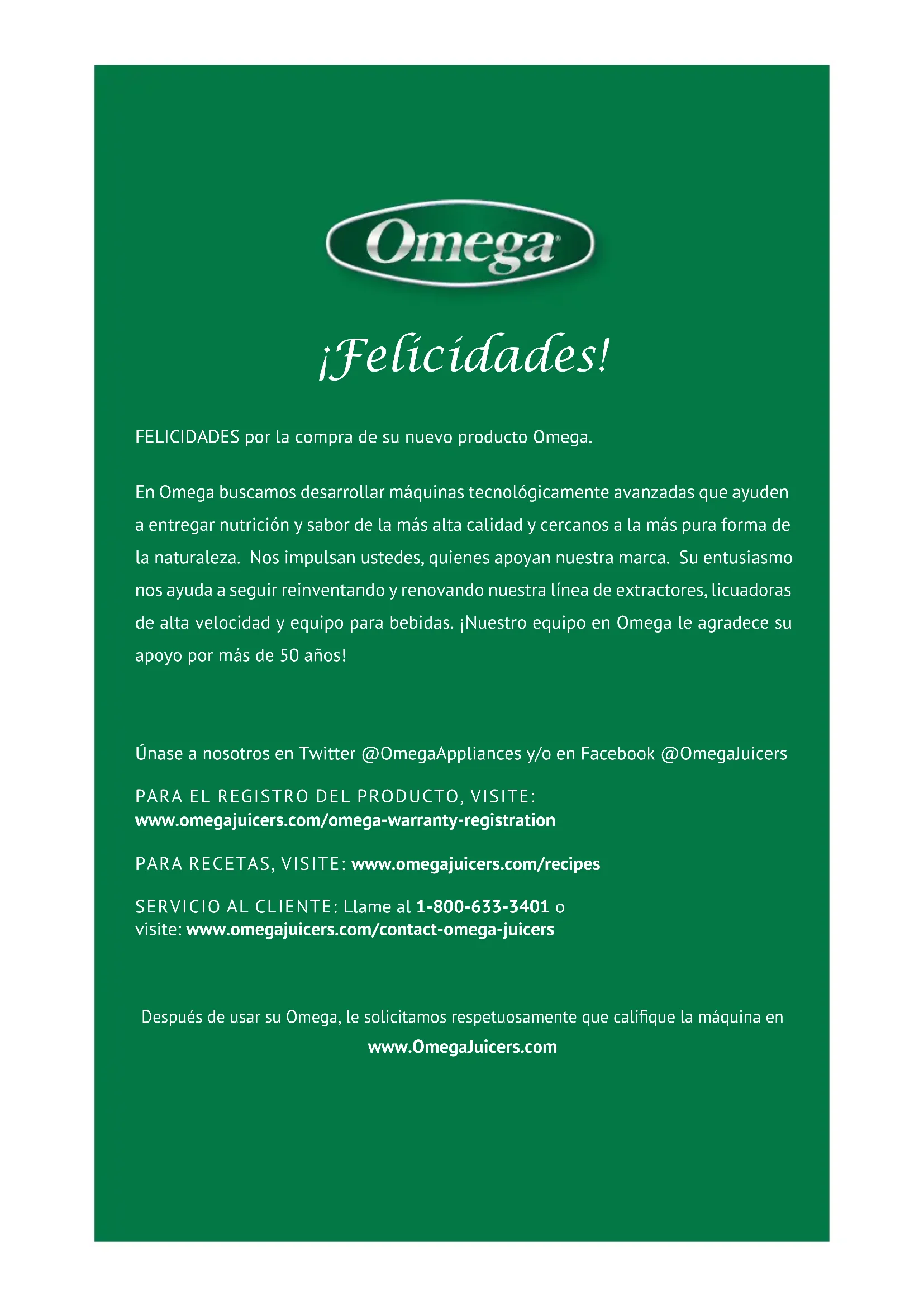67¡Felicidades! FELICIDADES por la compra de su nuevo producto Omega. En Omega buscamos desarrollar máquinas tecnológicamente avanzadas que ayuden a entregar nutrición y sabor de la más alta calidad y cercanos a la más pura forma de la naturaleza. Nos impulsan ustedes, quienes apoyan nuestra marca. Su entusiasmo nos ayuda a seguir reinventando y renovando nuestra línea de extractores, licuadoras de alta velocidad y equipo para bebidas. ¡Nuestro equipo en Omega le agradece su apoyo por más de 50 años! Únase a nosotros en Twitter @OmegaAppliances y/o en Facebook @OmegaJuicers PARA EL REGISTRO DEL PRODUCTO, VISITE: www.omegajuicers.com/omega-warranty-registration PARA RECETAS, VISITE: www.omegajuicers.com/recipes SERVICIO AL CLIENTE: Llame al 1-800-633-3401 o visite: www.omegajuicers.com/contact-omega-juicers Después de usar su Omega, le solicitamos respetuosamente que calique la máquina en www.OmegaJuicers.comTABLA DE CONTENIDOS
