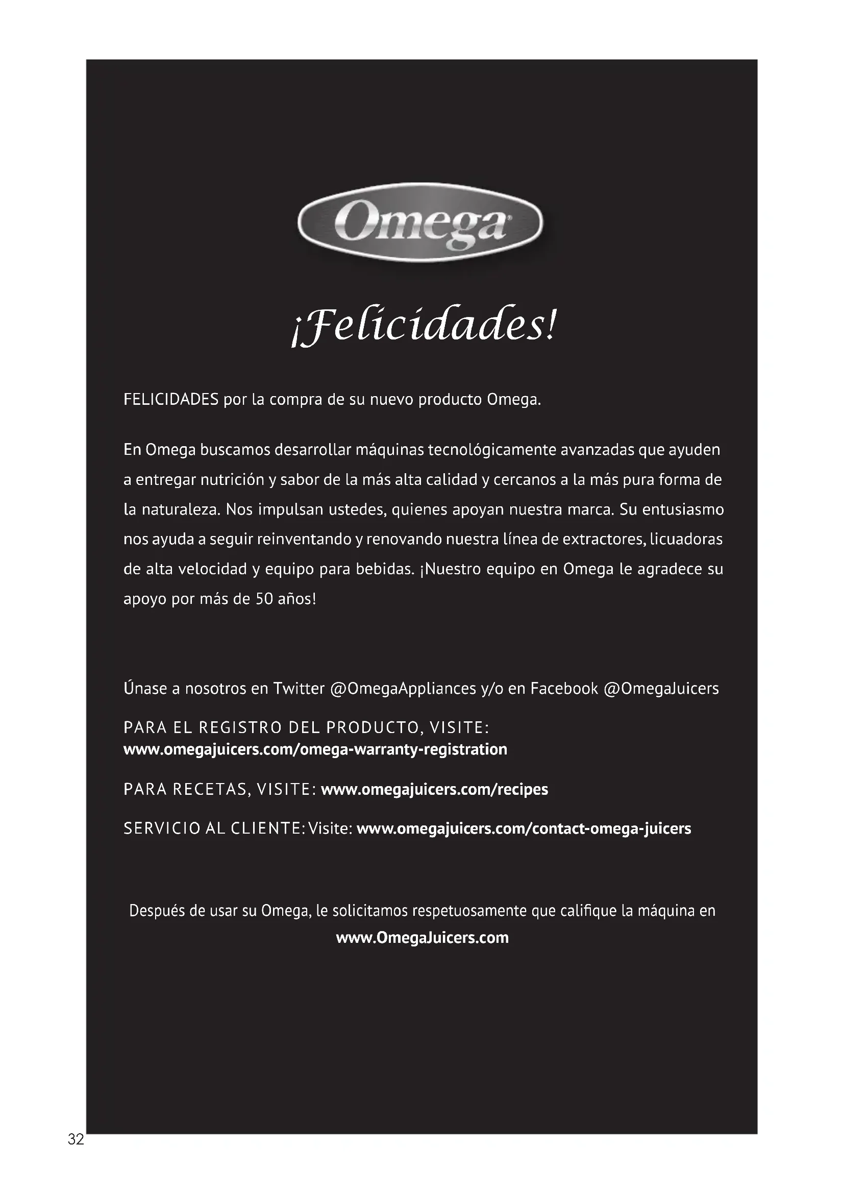 - Las sacudidas ligeras pueden ser causadas por el motor. PÓNGASE EN CONTACTO CON NOSOTROS: En línea: www.OmegaJuicers.com/contact-omega-juicers47