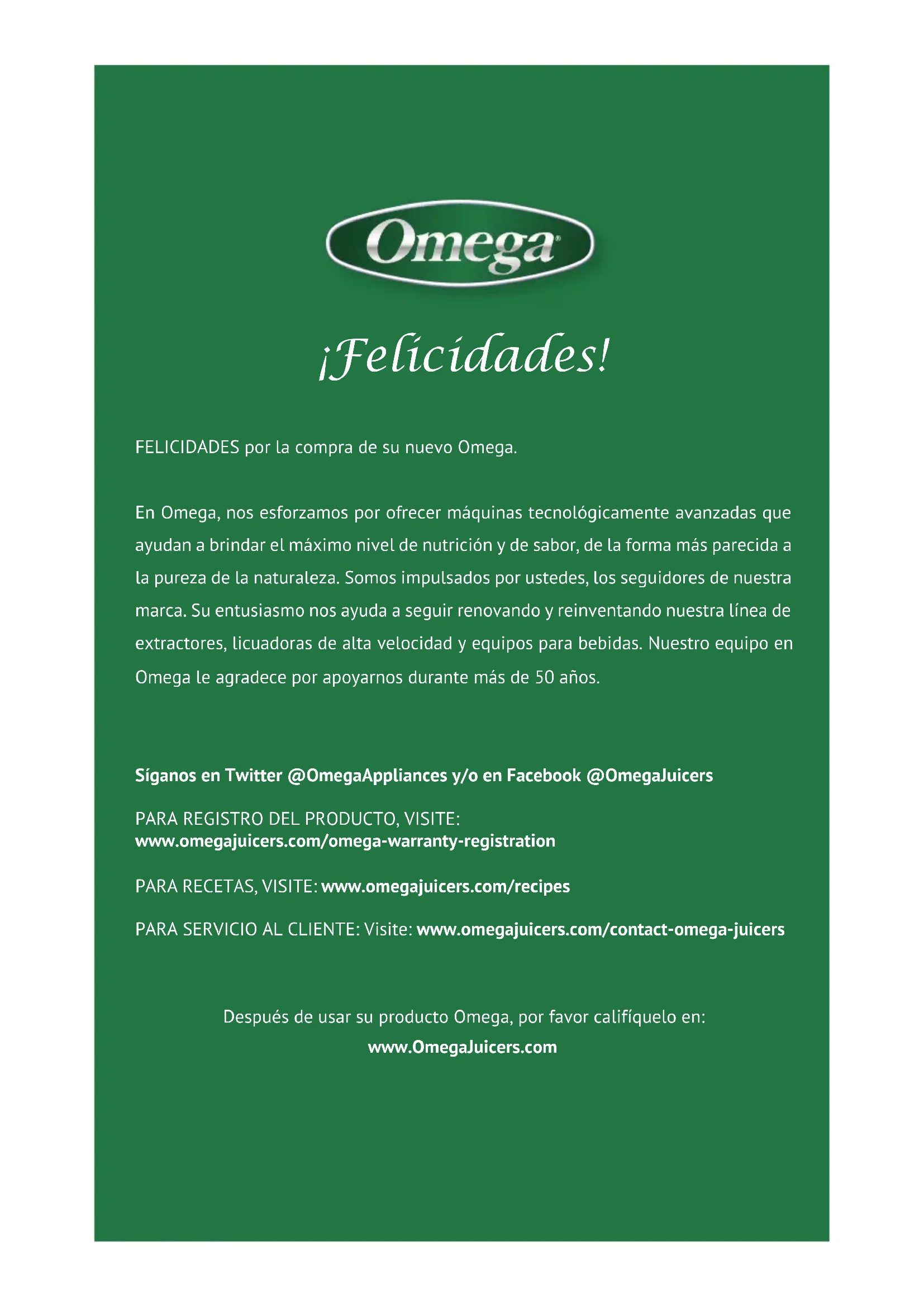 RECETTES¡Felicidades! FELICIDADES por la compra de su nuevo Omega. En Omega, nos esforzamos por ofrecer máquinas tecnológicamente avanzadas que ayudan a brindar el máximo nivel de nutrición y de sabor, de la forma más parecida a la pureza de la naturaleza. Somos impulsados por ustedes, los seguidores de nuestra marca. Su entusiasmo nos ayuda a seguir renovando y reinventando nuestra línea de extractores, licuadoras de alta velocidad y equipos para bebidas. Nuestro equipo en Omega le agradece por apoyarnos durante más de 50 años. Síganos en Twitter @OmegaAppliances y/o en Facebook @OmegaJuicers PARA REGISTRO DEL PRODUCTO, VISITE: www.omegajuicers.com/omega-warranty-registration PARA RECETAS, VISITE: www.omegajuicers.com/recipes PARA SERVICIO AL CLIENTE: Visite: www.omegajuicers.com/contact-omega-juicers Después de usar su producto Omega, por favor califíquelo en: www.OmegaJuicers.comÍNDICE