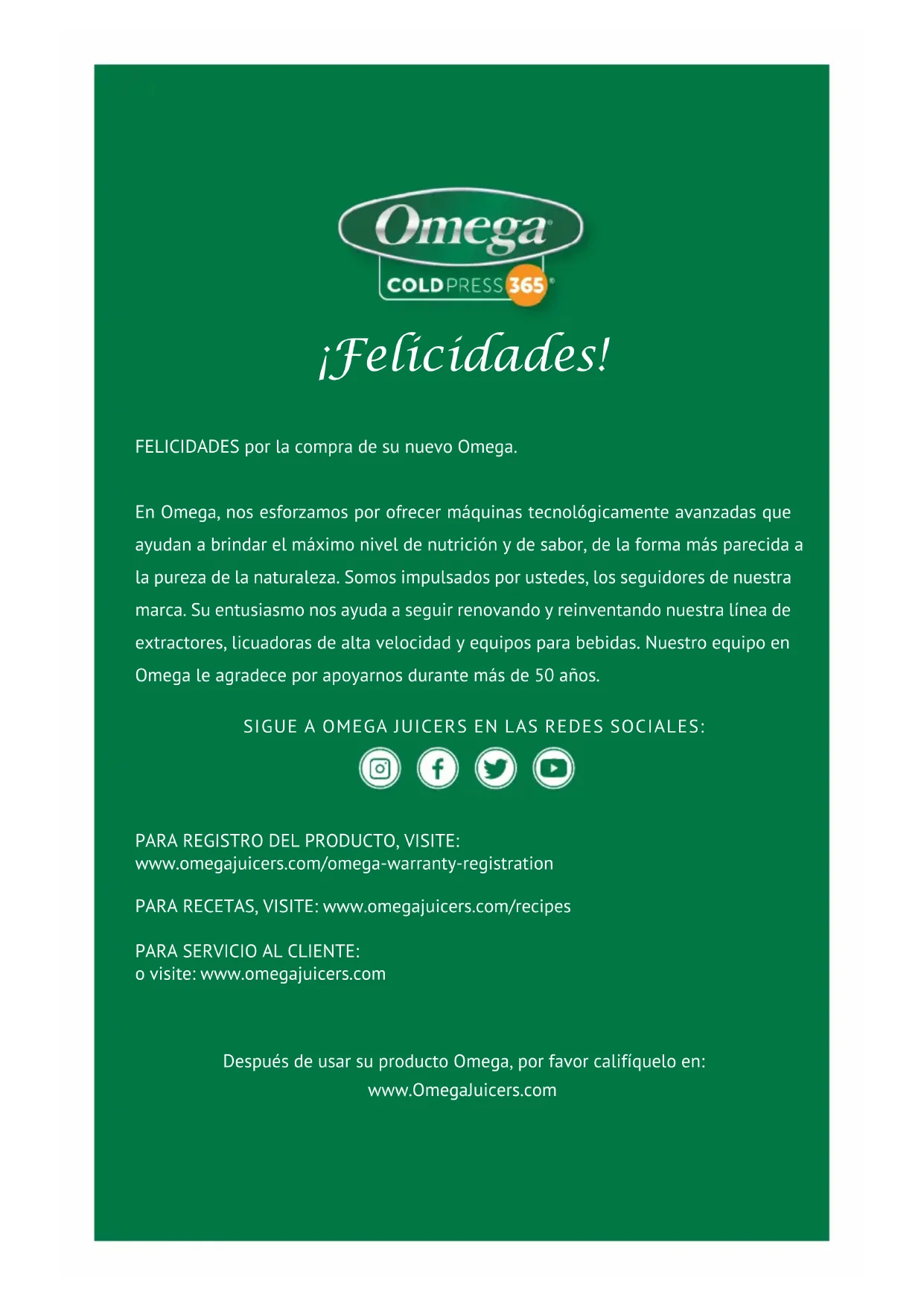 4¡Felicidades! FELICIDADES por la compra de su nuevo Omega. En Omega, nos esforzamos por ofrecer máquinas tecnológicamente avanzadas que ayudan a brindar el máximo nivel de nutrición y de sabor, de la forma más parecida a la pureza de la naturaleza. Somos impulsados por ustedes, los seguidores de nuestra marca. Su entusiasmo nos ayuda a seguir renovando y reinventando nuestra línea de extractores, licuadoras de alta velocidad y equipos para bebidas. Nuestro equipo en Omega le agradece por apoyarnos durante más de 50 años. PARA REGISTRO DEL PRODUCTO, VISITE: www.omegajuicers.com/omega-warranty-registration PARA RECETAS, VISITE: www.omegajuicers.com/recipes PARA SERVICIO AL CLIENTE: o visite: www.omegajuicers.com Después de usar su producto Omega, por favor califíquelo en: www.OmegaJuicers.com SIGUE A OMEGA JUICERS EN LAS REDES SOCIALES:TABLA DE CONTENIDO 54 -55 La seguridad primero, Disposiciones de seguridad importantes
