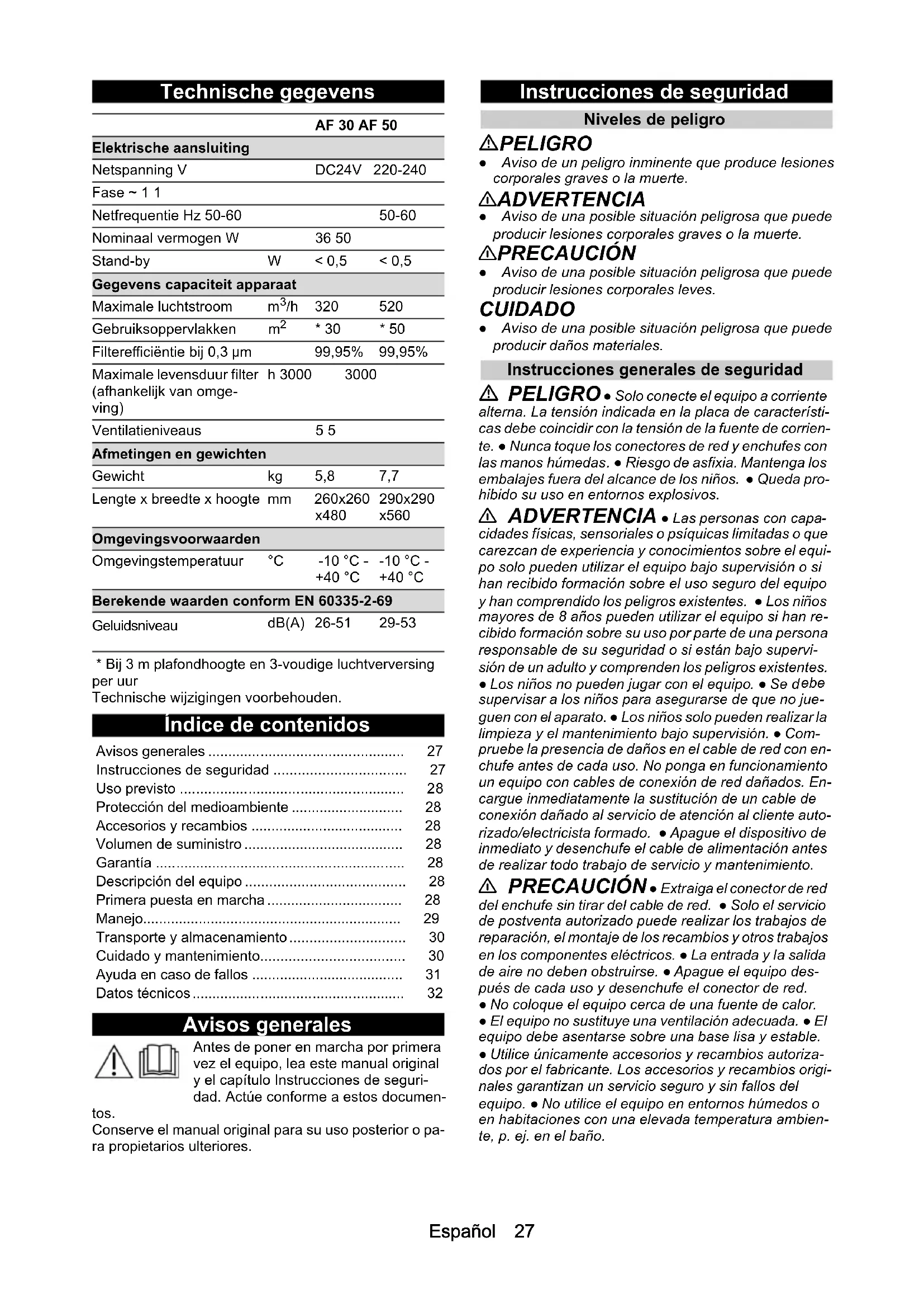 - Bij 3 m plafondhoogte en 3-voudige luchtverversing per uur Technische wijzigingen voorbehouden. Índice de contenidos Avisos generales Antes de poner en marcha por primera vez el equipo, lea este manual original y el capítulo Instrucciones de seguri- dad. Actúe conforme a estos documen- tos. Conserve el manual original para su uso posterior o pa- ra propietarios ulteriores. Instrucciones de seguridad Niveles de peligro PELIGRO ● Aviso de un peligro inminente que produce lesiones corporales graves o la muerte. 몇 ADVERTENCIA ● Aviso de una posible situación peligrosa que puede producir lesiones corporales graves o la muerte. 몇 PRECAUCIÓN ● Aviso de una posible situación peligrosa que puede producir lesiones corporales leves. CUIDADO ● Aviso de una posible situación peligrosa que puede producir daños materiales. Instrucciones generales de seguridad PELIGRO ● Solo conecte el equipo a corriente alterna. La tensión indicada en la placa de característi- cas debe coincidir con la tensión de la fuente de corrien- te. ● Nunca toque los conectores de red y enchufes con las manos húmedas. ● Riesgo de asfixia. Mantenga los embalajes fuera del alcance de los niños. ● Queda pro- hibido su uso en entornos explosivos. 몇 ADVERTENCIA ● Las personas con capa- cidades físicas, sensoriales o psíquicas limitadas o que carezcan de experiencia y conocimientos sobre el equi- po solo pueden utilizar el equipo bajo supervisión o si han recibido formación sobre el uso seguro del equipo y han comprendido los peligros existentes. ● Los niños mayores de 8 años pueden utilizar el equipo si han re- cibido formación sobre su uso por parte de una persona responsable de su seguridad o si están bajo supervi- sión de un adulto y comprenden los peligros existentes. ● Los niños no pueden jugar con el equipo. ● Se d ebe supervisar a los niños para asegurarse de que no jue- guen con el aparato. ● Los niños solo pueden realizar la limpieza y el mantenimiento bajo supervisión. ● Com- pruebe la presencia de daños en el cable de red con en- chufe antes de cada uso. No ponga en funcionamiento un equipo con cables de conexión de red dañados. En- cargue inmediatamente la sustitución de un cable de conexión dañado al servicio de atención al cliente auto- rizado/electricista formado. ● Apague el dispositivo de inmediato y desenchufe el cable de alimentación antes de realizar todo trabajo de servicio y mantenimiento. 몇 PRECAUCIÓN ● Extraiga el conector de red del enchufe sin tirar del cable de red. ● Solo el servicio de postventa autorizado puede realizar los trabajos de reparación, el montaje de los recambios y otros trabajos en los componentes eléctricos. ● La entrada y la salida de aire no deben obstruirse. ● Apague el equipo des- pués de cada uso y desenchufe el conector de red. ● No coloque el equipo cerca de una fuente de calor. ● El equipo no sustituye una ventilación adecuada. ● El equipo debe asentarse sobre una base lisa y estable. ● Utilice únicamente accesorios y recambios autoriza- dos por el fabricante. Los accesorios y recambios origi- nales garantizan un servicio seguro y sin fallos del equipo. ● No utilice el equipo en entornos húmedos o en habitaciones con una elevada temperatura ambien- te, p. ej. en el baño. AF 30 AF 50 Elektrische aansluiting Netspanning V Fase ~ 1 1 Netfrequentie Hz 50-60 50-60 Nominaal vermogen W