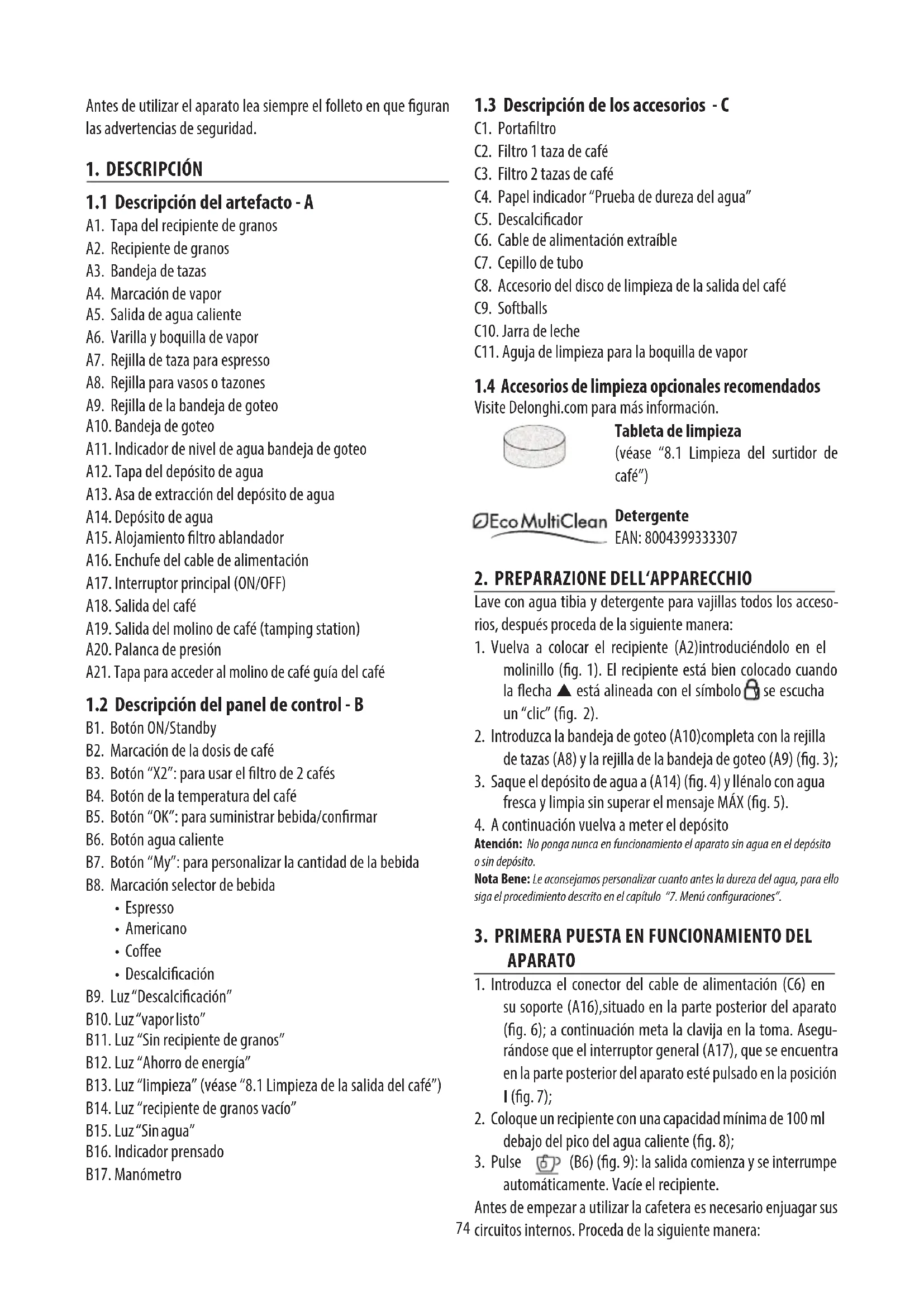 Visite Delonghi.com para más información. Tableta de limpieza (véase “8.1 Limpieza del surtidor de café”) Detergente EAN: 8004399333307