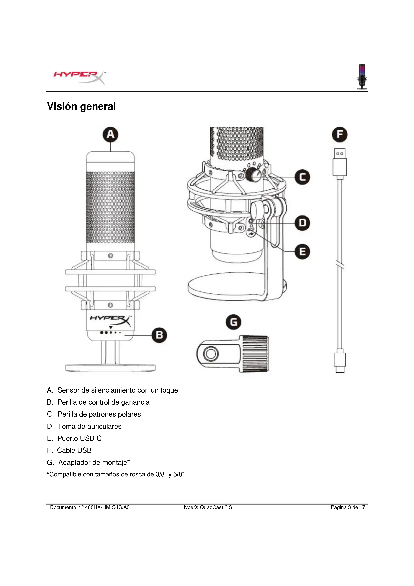 Visión general A. Sensor de silenciamiento con un toque B. Perilla de control de ganancia C. Perilla de patrones polares D. Toma de auriculares E. Puerto USB-C F. Cable USB G. Adaptador de montaje* *Compatible con tamaños de rosca de 3/8” y 5/8”Documento n.º 480HX-HMIQ1S.A01 HyperX QuadCast