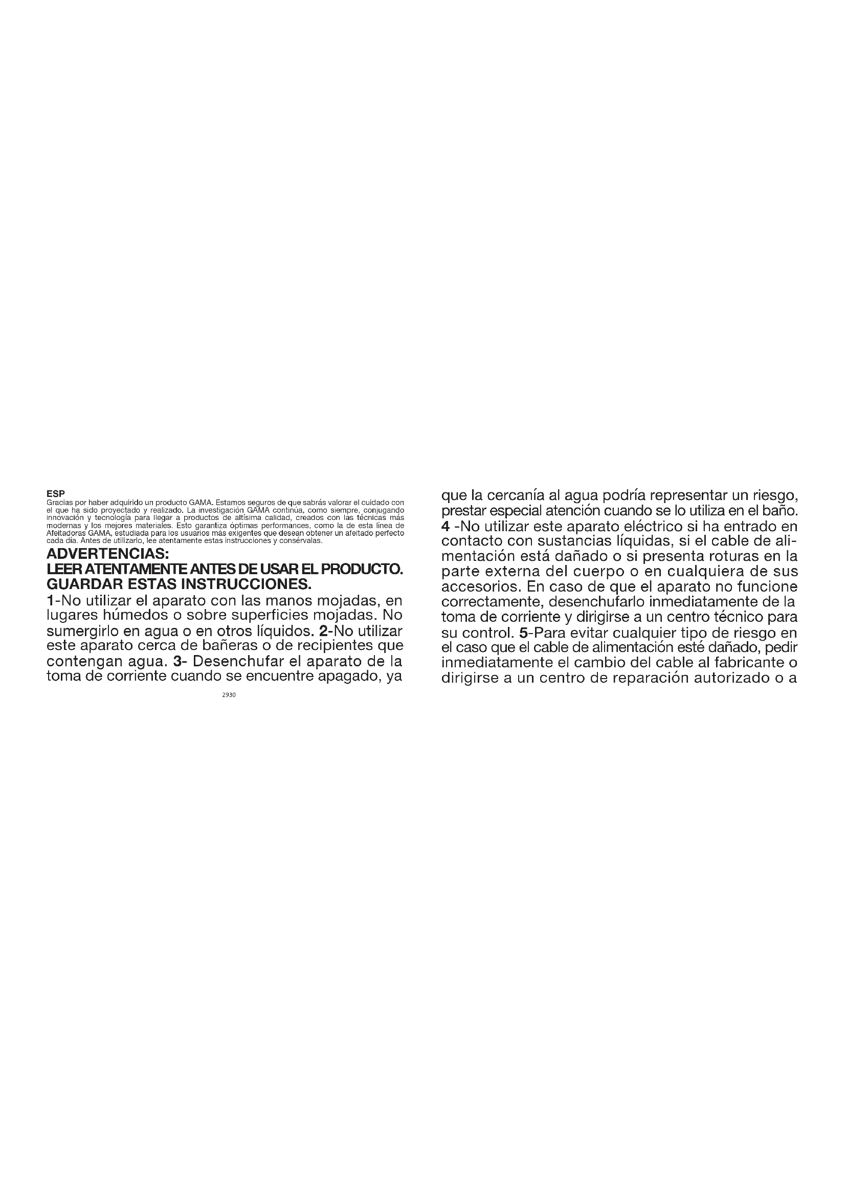 - Après avoir effectué le nettoyage, chaque tête devra être insérée dans la position initiale en utilisant l'emboîtement correspondant. Nous conseillons de lubrifier les têtes du rasoir avec une goutte d'huile tous les 2 à 3 mois. Rendez-vous sur le site www.gamaprofessional.fr pour trouver les manuels du produit et les avertissements d'utilisation. 27 28ESP Gracias por haber adquirido un producto GAMA. Estamos seguros de que sabrás valorar el cuidado con el que ha sido proyectado y realizado. La investigación GAMA continúa, como siempre, conjugando innovación y tecnología para llegar a productos de altísima calidad, creados con las técnicas más modernas y los mejores materiales. Esto garantiza óptimas performances, como la de esta línea de Afeitadoras GAMA, estudiada para los usuarios más exigentes que desean obtener un afeitado perfecto cada día. Antes de utilizarlo, lee atentamente estas instrucciones y consérvalas. ADVERTENCIAS: LEER ATENTAMENTE ANTES DE USAR EL PRODUCTO. GUARDAR ESTAS INSTRUCCIONES. 1-No utilizar el aparato con las manos mojadas, en lugares húmedos o sobre superficies mojadas. No sumergirlo en agua o en otros líquidos. 2-No utilizar este aparato cerca de bañeras o de recipientes que contengan agua. 3- Desenchufar el aparato de la toma de corriente cuando se encuentre apagado, ya que la cercanía al agua podría representar un riesgo, prestar especial atención cuando se lo utiliza en el baño. 4 -No utilizar este aparato eléctrico si ha entrado en contacto con sustancias líquidas, si el cable de ali- mentación está dañado o si presenta roturas en la parte externa del cuerpo o en cualquiera de sus accesorios. En caso de que el aparato no funcione correctamente, desenchufarlo inmediatamente de la toma de corriente y dirigirse a un centro técnico para su control. 5-Para evitar cualquier tipo de riesgo en el caso que el cable de alimentación esté dañado, pedir inmediatamente el cambio del cable al fabricante o dirigirse a un centro de reparación autorizado o a 29 30personal cualificado.