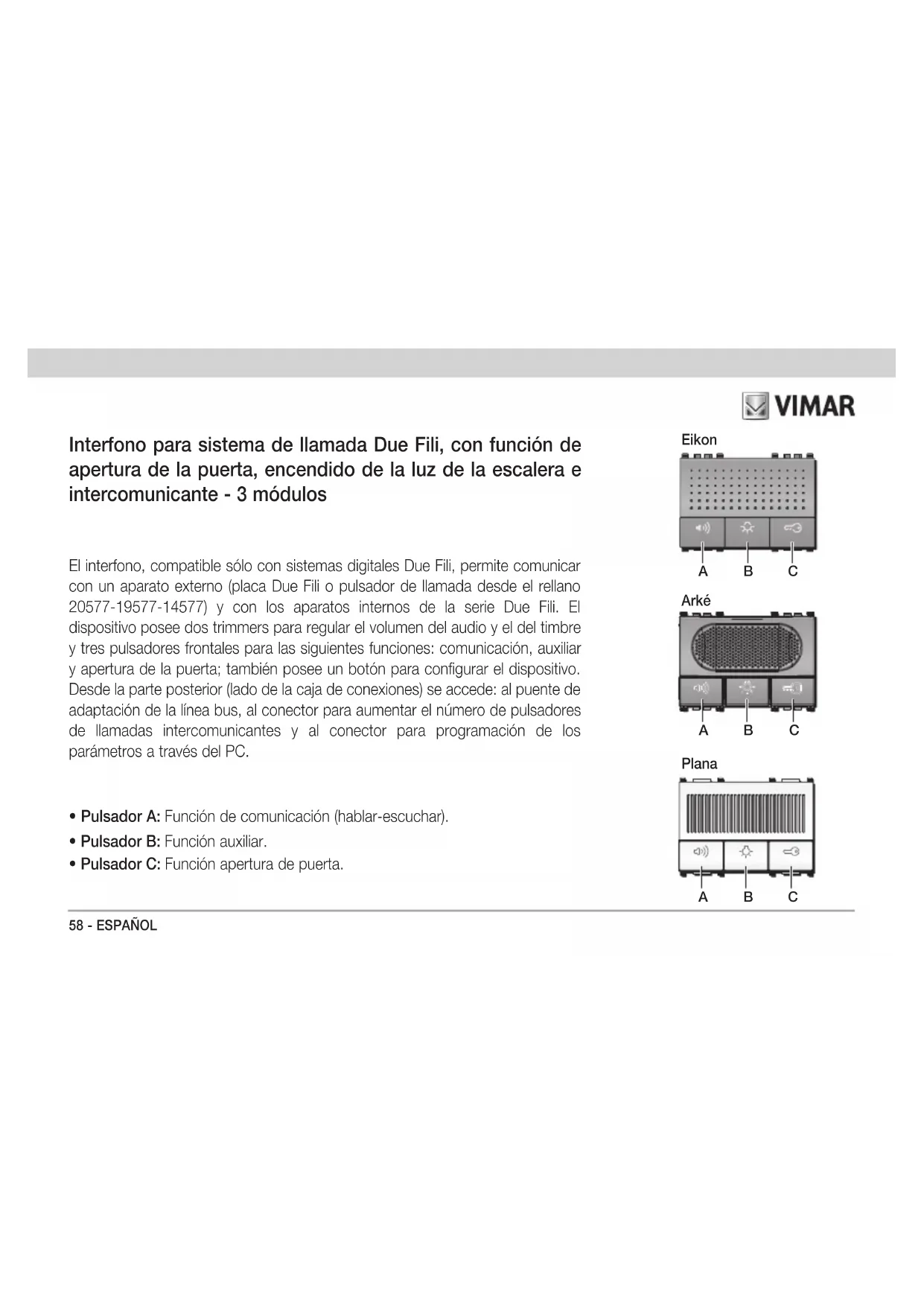- Pulsador C: Función apertura de puerta. Interfono para sistema de llamada Due Fili, con función de apertura de la puerta, encendido de la luz de la escalera e intercomunicante - 3 módulos Eikon Plana B CA B CA Arké