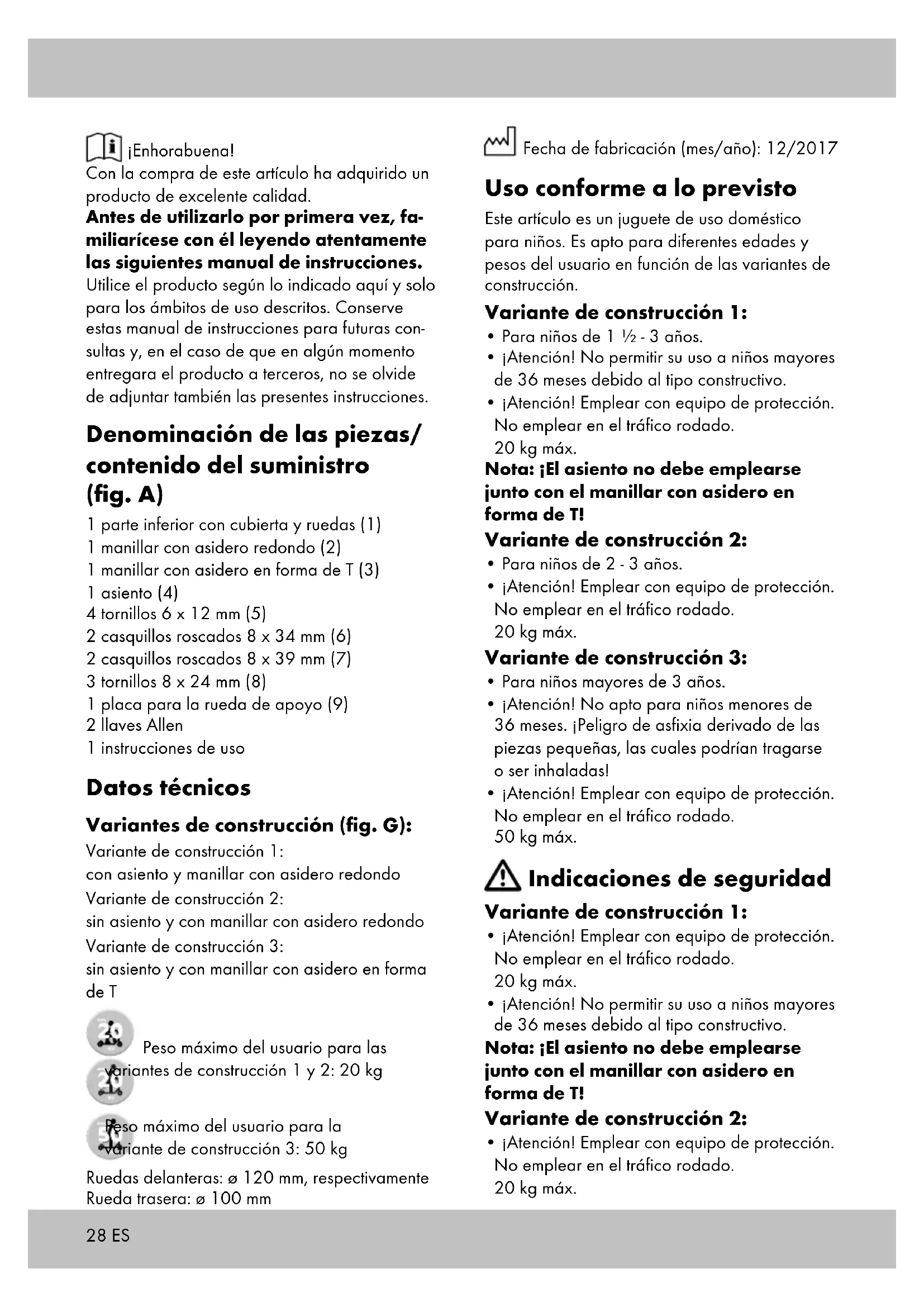 - Evite el agua, el aceite, los baches y los terrenos muy ásperos. Montaje Montaje del manillar (fig. B) Necesitará la parte inferior (1) y para las variantes de construcción 1 y 2 el manillar con asidero redondo (2); para la 3 el manillar con asidero en forma de T (3). Presione el pasador (2a, 3a) e introduzca el manillar en la parte inferior (fig. B). Importante: Tenga cuidado de que el manillar se encaje en la parte inferior. Montaje de la variante de construcción 1 (fig. C) Coloque el asiento (4) sobre la parte inferior (1). Tenga cuidado de que los orificios del asi- ento y la parte inferior queden colocados unos sobre otros. Introduzca los casquillos cortos (6) desde arriba por los dos orificios delanteros y fíjelos por abajo con dos tornillos (5). Introduz- ca los casquillos largos (7) desde arriba por los dos orificios traseros y los orificios traseros de la placa para la rueda de apoyo (9). Fíjelos por abajo con dos tornillos (5). Coloque un tornillo (8) en el taladro delantero de la placa para la rueda de apoyo y apriételo (fig. D). Para el montaje emplee la llave Allen adjunta. Montaje de la variante de construcción 2 (fig. E) Fije la placa para la rueda de apoyo en los tres orificios traseros con los tornillos (8) y apriete los torillos con la llave Allen adjunta. Ajuste de altura del asiento (fig. F) El asiento puede ajustarse en alturas diferentes de aprox. 26 - 32 cm. Suelte para ello el tornillo de fijación (4a) y ajuste la altura deseada. Vuel- va a apretar el tornillo de fijación con firmeza.30 ES Desmontaje Desmontaje del manillar Presione el pasador (2a, 3a) de la parte trasera de la parte inferior y extraiga el manillar (fig. B). Desmontaje del asiento Suelte los tornillos y extraiga los casquillos rosca- dos. Quite el asiento. Uso Conducción Dependiendo de la variante de construcción, sentarse en el asiento y dar impulso con las dos piernas empujando de forma regular o, si se usa sin asiento, poner una pierna en la cubierta y darse impulso con la otra empujando de forma regular. El artículo se controla desplazando el peso. Frenado En la variante de construcción con asiento se frena poniendo los dos pies en el suelo. Si se usa sin asiento, se frena pisando el freno por fricción de la rueda trasera con un pie. Mantenimiento Sustitución de las ruedas delanteras Las ruedas delanteras pueden cambiarse. ¡Importante! Observe los datos técnicos. Las rue- das con diámetros diferentes pueden modificar las características de marcha y poner en peligro a los usuarios bajo determinadas circunstancias. No use ruedas que no puedan montarse correctamente. No monte bajo ningún concepto ruedas mayores que las originales del artículo. Las ruedas están sometidas al desgaste. Éste de- pende de múltiples factores como, por ejemplo, el terreno, la altura y el peso del usuario, las con- diciones climatológicas, el material de las ruedas y su dureza. Por ello, es necesario cambiarlas de vez en cuando.