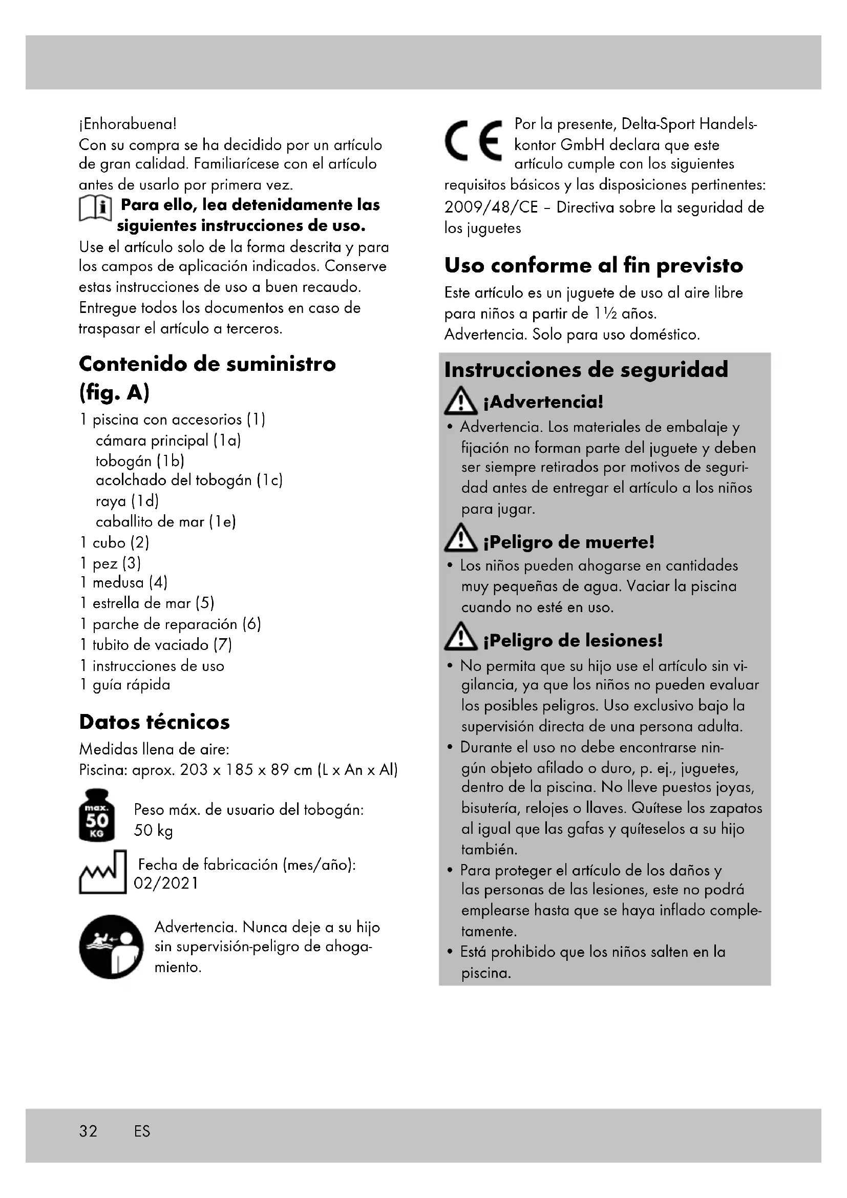 Pokyny k záruke a priebehu servisu Produkt bol vyrobený s maximálnou zodpo- vednosťou a v priebehu výroby bol neustále kontrolovaný. Na tento produkt máte tri roky záruku od dátumu kúpy produktu. Pokladničný lístok si odložte. Záruka sa vzťahuje len na chyby materiálu a výrobné chyby a zaniká pri neodbornej manipulácii s produktom. Záruka nemá vplyv na Vaše zákonné práva, predovšetkým na práva vyplývajúce zo záruky. V prípade reklamácie sa obráťte na nižšie uve- denú servisnú linku, alebo nám napíšte e-mail. Naši servisní zamestnanci sa s Vami dohodnú na ďalšom postupe a urýchlene vykonajú všetky potrebné kroky. V každom prípade Vám poradíme osobne. Záručná lehota sa nepredlžuje v dôsledku even- tuálnych opráv na základe záruky, zákonného plnenia záruky alebo v dôsledku prejavu ochoty. To platí tiež pre vymenené alebo opravené die- ly. Opravy vykonané po uplynutí záručnej lehoty sú spoplatnené. IAN: 351982_2007 Servis Slovensko Tel.: 0850 232001 E-Mail: deltasport@lidl.sk32 ¡Enhorabuena! Con su compra se ha decidido por un artículo de gran calidad. Familiarícese con el artículo antes de usarlo por primera vez. Para ello, lea detenidamente las siguientes instrucciones de uso. Use el artículo solo de la forma descrita y para los campos de aplicación indicados. Conserve estas instrucciones de uso a buen recaudo. Entregue todos los documentos en caso de traspasar el artículo a terceros. Contenido de suministro (fig. A) 1 piscina con accesorios (1) cámara principal (1a) tobogán (1b) acolchado del tobogán (1c) raya (1d) caballito de mar (1e) 1 cubo (2) 1 pez (3) 1 medusa (4) 1 estrella de mar (5) 1 parche de reparación (6) 1 tubito de vaciado (7) 1 instrucciones de uso 1 guía rápida Datos técnicos Medidas llena de aire: Piscina: aprox. 203 x 185 x 89 cm (L x An x Al) Peso máx. de usuario del tobogán: 50 kg Fecha de fabricación (mes/año): 02/2021 Advertencia. Nunca deje a su hijo sin supervisión-peligro de ahoga- miento. Por la presente, Delta-Sport Handels- kontor GmbH declara que este artículo cumple con los siguientes requisitos básicos y las disposiciones pertinentes: 2009/48/CE – Directiva sobre la seguridad de los juguetes Uso conforme al fin previsto Este artículo es un juguete de uso al aire libre para niños a partir de 1½ años. Advertencia. Solo para uso doméstico. Instrucciones de seguridad ¡Advertencia!