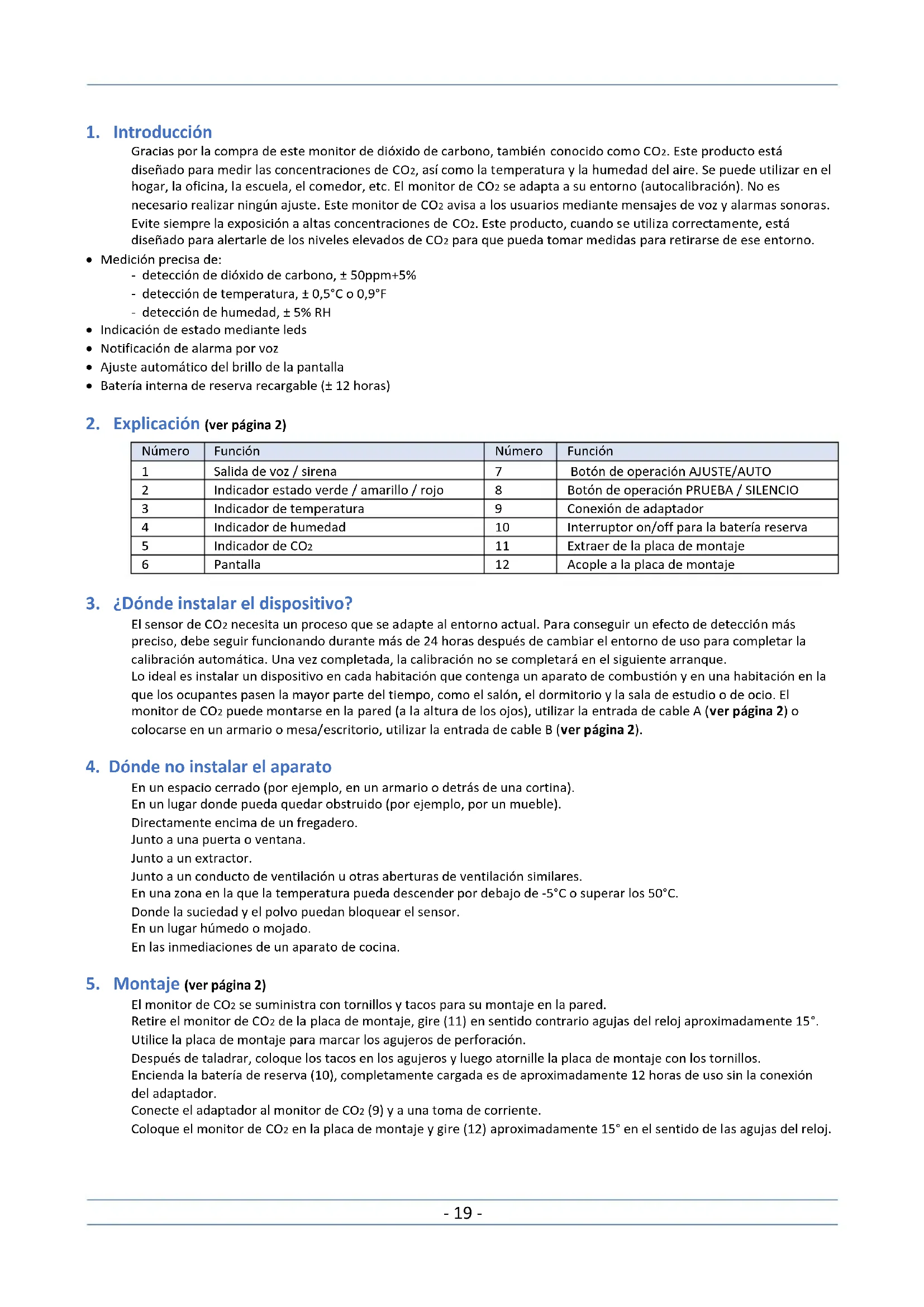 Gracias por la compra de este monitor de dióxido de carbono, también conocido como CO2. Este producto está diseñado para medir las concentraciones de CO2, así como la temperatura y la humedad del aire. Se puede utilizar en el hogar, la oficina, la escuela, el comedor, etc. El monitor de CO2 se adapta a su entorno (autocalibración). No es necesario realizar ningún ajuste. Este monitor de CO2 avisa a los usuarios mediante mensajes de voz y alarmas sonoras. Evite siempre la exposición a altas concentraciones de CO2. Este producto, cuando se utiliza correctamente, está diseñado para alertarle de los niveles elevados de CO2 para que pueda tomar medidas para retirarse de ese entorno.
