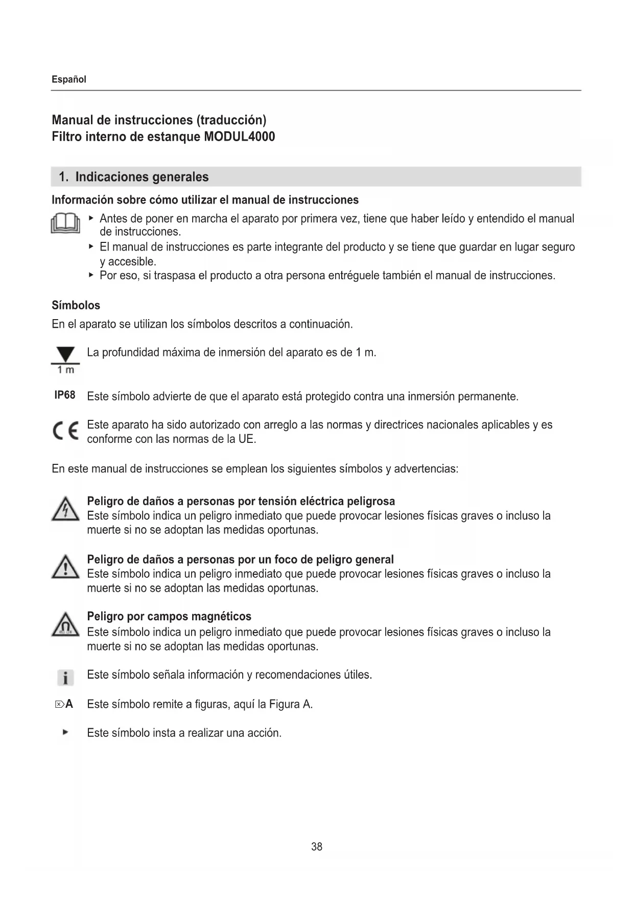 Información sobre cómo utilizar el manual de instrucciones ▶ Antes de poner en marcha el aparato por primera vez, tiene que haber leído y entendido el manual de instrucciones. ▶ El manual de instrucciones es parte integrante del producto y se tiene que guardar en lugar seguro y accesible. ▶ Por eso, si traspasa el producto a otra persona entréguele también el manual de instrucciones. Símbolos En el aparato se utilizan los símbolos descritos a continuación. La profundidad máxima de inmersión del aparato es de 1 m. Este símbolo advierte de que el aparato está protegido contra una inmersión permanente. Este aparato ha sido autorizado con arreglo a las normas y directrices nacionales aplicables y es conforme con las normas de la UE. En este manual de instrucciones se emplean los siguientes símbolos y advertencias: Peligro de daños a personas por tensión eléctrica peligrosa Este símbolo indica un peligro inmediato que puede provocar lesiones físicas graves o incluso la muerte si no se adoptan las medidas oportunas. Peligro de daños a personas por un foco de peligro general Este símbolo indica un peligro inmediato que puede provocar lesiones físicas graves o incluso la muerte si no se adoptan las medidas oportunas. Peligro por campos magnéticos Este símbolo indica un peligro inmediato que puede provocar lesiones físicas graves o incluso la muerte si no se adoptan las medidas oportunas. Este símbolo señala información y recomendaciones útiles. Este símbolo remite a guras, aquí la Figura A. Este símbolo insta a realizar una acción. IP68 ⌦A39 Español