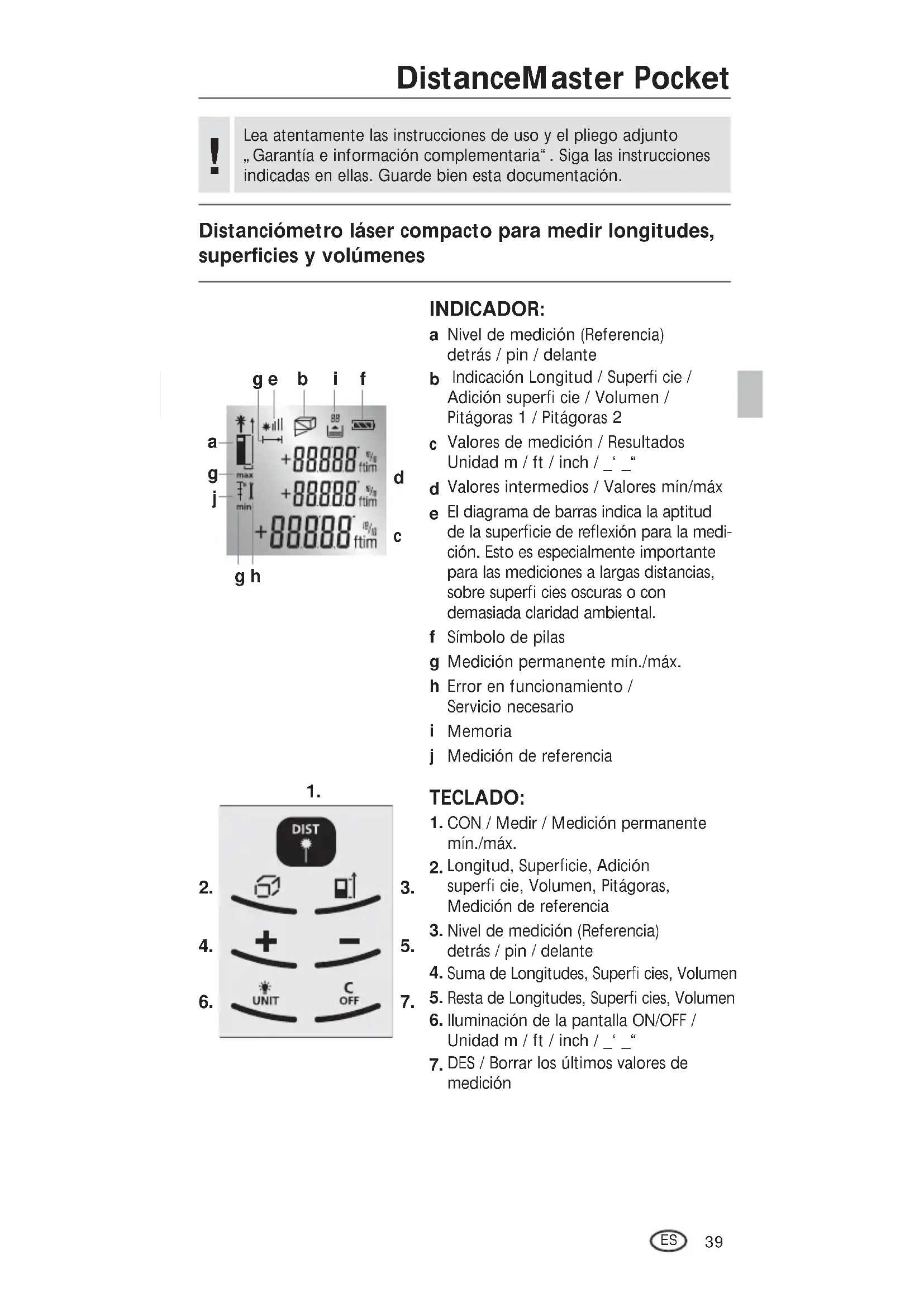 CON / Medir / Medición permanente mín./máx. Longitud, SuperÖ cie, Adición superÖ cie, Volumen, Pitágoras, Medición de referenciaNivel de medición (Referencia) detrás / pin / delanteSuma de Longitudes, SuperÖ cies, VolumenResta de Longitudes, SuperÖ cies, VolumenIluminación de la pantalla ON/OFF / Unidad m / ft / inch / _‘ _“DES / Borrar los últimos valores de medición Distanciómetro láser compacto para medir longitudes, superficies y volúmenes 1.3Karte_Manual_DistanceMaster-Pocket_Rev.0612.indd 39 02.08.12 10:253 sec