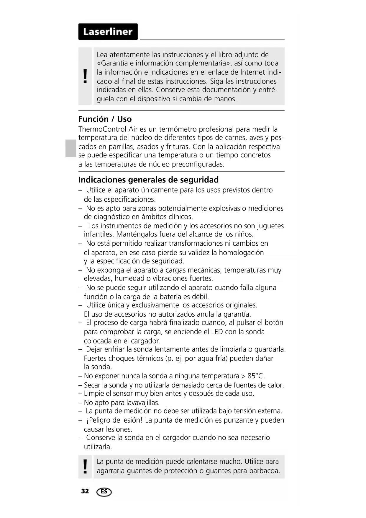Salvo modificaciones. 20W05 Disposiciones europeas y eliminación El aparato cumple todas las normas requeridas para el libre tráfico de mercancías en la UE. Se trata de un aparato eléctrico, por lo que debe ser recogido y eliminado por separado conforme a la directiva europea relativa a los aparatos eléctricos y electrónicos usados. Más información detallada y de seguridad en: http://laserliner.com/info?an=AJI Datos Técnicos Magnitud Temperatura de contacto Temperatura ambiente Rango de medición temperatura de contacto 0°C … 85°C Precisión tempera- tura de contacto ± 1°C Rango de medición temperatura ambiente 0°C … 300°C Tipo de protección IP 66 Alimentación 1 x 1,5V LR6 (AA) Autonomía de trabajo aprox. 4 h Condiciones de trabajo Sonda: 0°C … 85°C, Cargador: -10°C … 50°C, Humedad del aire máx. 85% h.r., no condensante, Alti- tud de trabajo máx. 2000 m sobre el nivel del mar (nivel normal cero) Condiciones de almacén -10°C … 60°C, Humedad del aire máx. 85% h.r., no condensante Datos de servicio del módulo radio- eléctrico Interfaz de Bluetooth LE 4.x; Banda de frecuencias: banda ISM 2400-2483.5 MHz, 40 canales; Potencia de emisión: máx. 10mW; Anchura de banda: 2 MHz; Velocidad binaria: 1 Mbit/s; Modulación: GFSK / FHSS Dimensiones (An x Al x F) 168 x 24 x 40 mm Sonda 90 mm, ø 5,9 mm Peso 80 g (pila incluida) ES38 Funzione / Utilizzo Il ThermoControl Air è un termometro professionale per grill, cottura e arrosto per il rilevamento della temperatura al cuore di diversi tipi di carne, pollame e pesce. Tramite la relativa app è possibile impostare temperature al cuore predefinite, una temperatura specifica o un tempo determinato. Leggere attentamente le istruzioni per l‘uso, l’opuscolo allegato „Ulteriori informazioni e indicazioni garanzia“, nonché le informazioni e le indicazioni più recenti raggi- ungibili con il link riportato al termine di queste istruzioni. Questo documento deve essere conservato e fornito insieme all‘apparecchio in caso questo venga inoltrato a terzi.