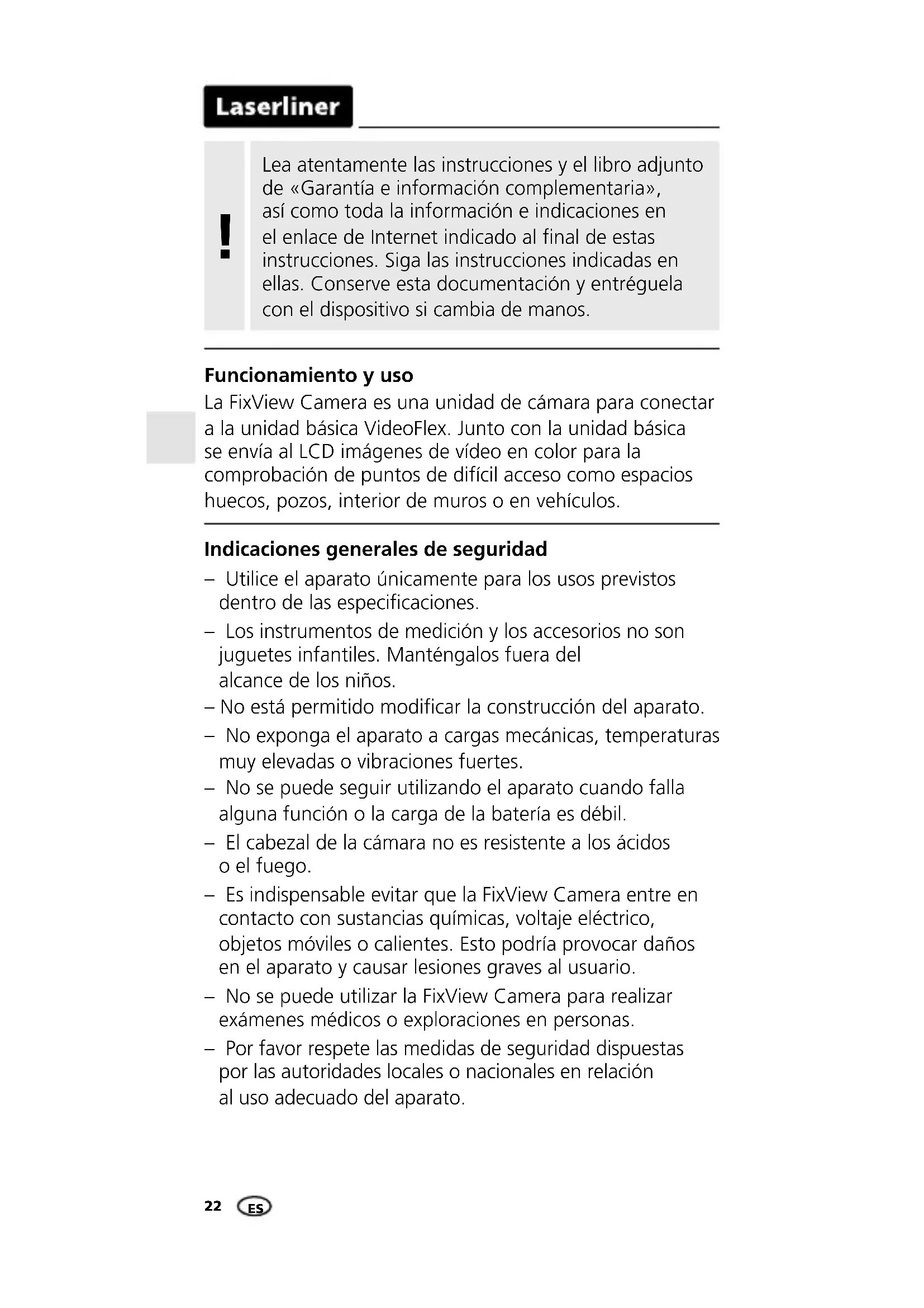 Funcionamiento y uso La FixView Camera es una unidad de cámara para conectar a la unidad básica VideoFlex. Junto con la unidad básica se envía al LCD imágenes de vídeo en color para la comprobación de puntos de difícil acceso como espacios huecos, pozos, interior de muros o en vehículos. Indicaciones generales de seguridad – Utilice el aparato únicamente para los usos previstos dentro de las especicaciones. – Los instrumentos de medición y los accesorios no son juguetes infantiles. Manténgalos fuera del alcance de los niños. – No está permitido modicar la construcción del aparato. – No exponga el aparato a cargas mecánicas, temperaturas muy elevadas o vibraciones fuertes. – No se puede seguir utilizando el aparato cuando falla alguna función o la carga de la batería es débil. – El cabezal de la cámara no es resistente a los ácidos o el fuego. – Es indispensable evitar que la FixView Camera entre en contacto con sustancias químicas, voltaje eléctrico, objetos móviles o calientes. Esto podría provocar daños en el aparato y causar lesiones graves al usuario. – No se puede utilizar la FixView Camera para realizar exámenes médicos o exploraciones en personas. – Por favor respete las medidas de seguridad dispuestas por las autoridades locales o nacionales en relación al uso adecuado del aparato. ESFixView Camera