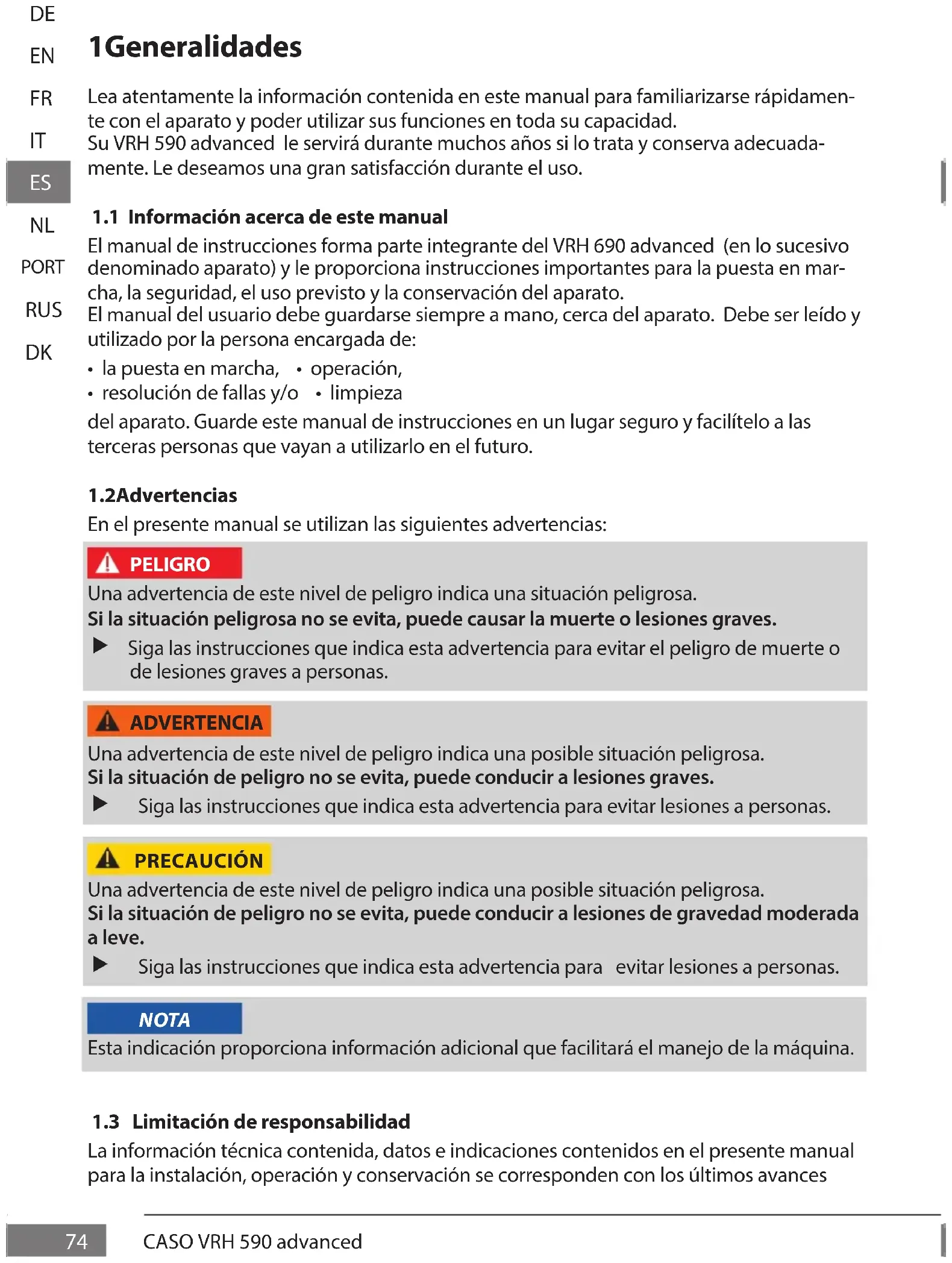 La información técnica contenida, datos e indicaciones contenidos en el presente manual para la instalación, operación y conservación se corresponden con los últimos avances NOTA75 CASO VRH 590 advanced