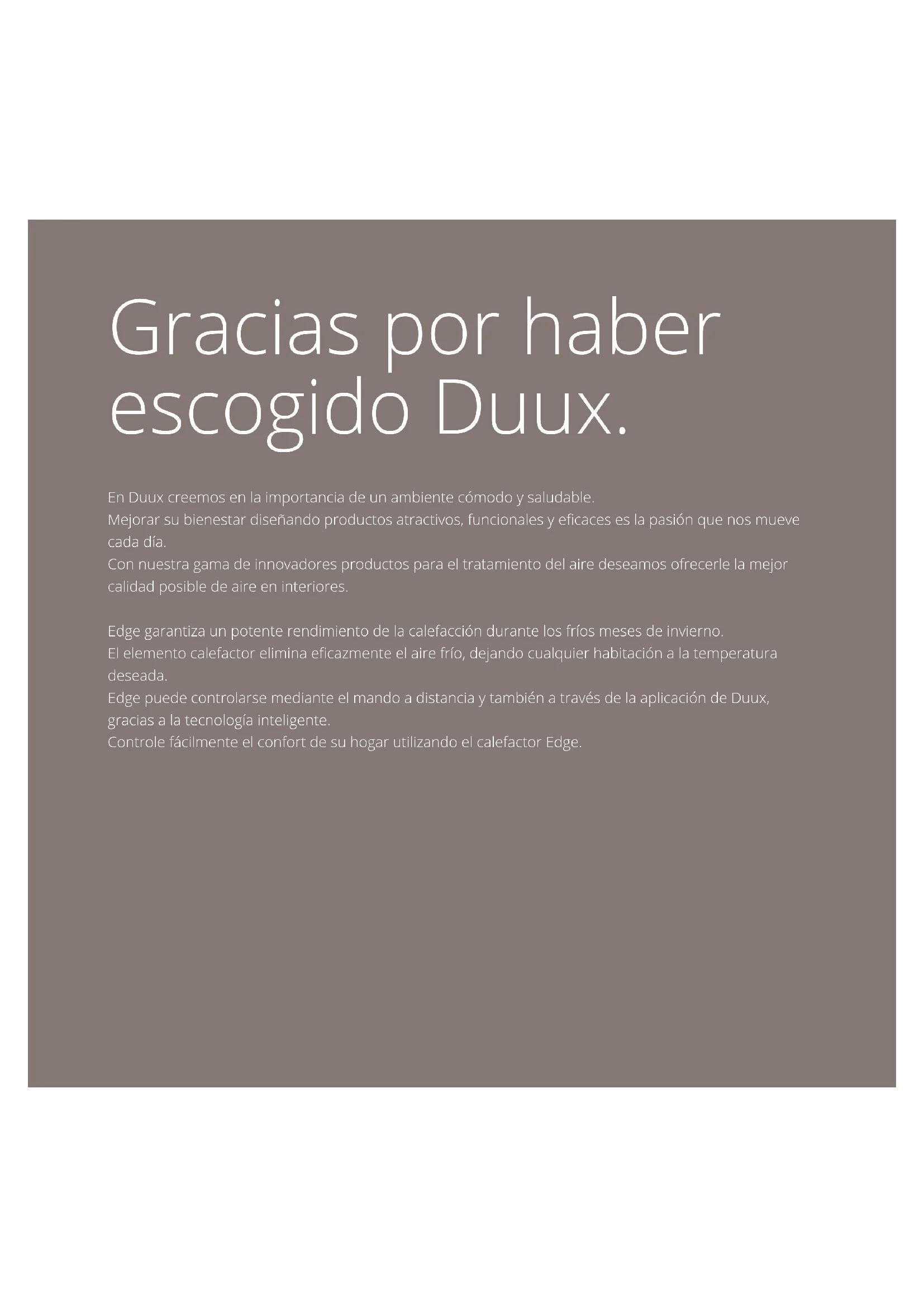 Hilfsstromverbrauch Bei Nennwärmeleistung 1000 Wh 1500 Wh 2000 Wh Bei minimaler Heizleistung 500 Wh 750 Wh 1000 Wh Im Standby-Modus 0,8 Wh 0,8 Wh 0,8 Wh Die wichtigsten Daten zum Produkt ndest du auch auf dem Typenschild. Das Typenschild bendet sich auf der Rückseite des Produkts. Aussehen und Spezikationen dieses Geräts können ohne Vorankündigung geändert werden.Gracias por haber escogido Duux. En Duux creemos en la importancia de un ambiente cómodo y saludable. Mejorar su bienestar diseñando productos atractivos, funcionales y ecaces es la pasión que nos mueve cada día. Con nuestra gama de innovadores productos para el tratamiento del aire deseamos ofrecerle la mejor calidad posible de aire en interiores. Edge garantiza un potente rendimiento de la calefacción durante los fríos meses de invierno. El elemento calefactor elimina ecazmente el aire frío, dejando cualquier habitación a la temperatura deseada. Edge puede controlarse mediante el mando a distancia y también a través de la aplicación de Duux, gracias a la tecnología inteligente. Controle fácilmente el confort de su hogar utilizando el calefactor Edge.91