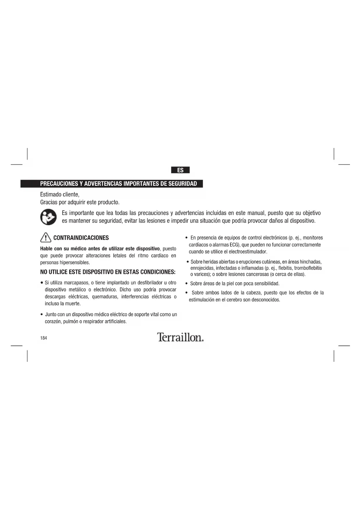 Estimado cliente, Gracias por adquirir este producto. Es importante que lea todas las precauciones y advertencias incluidas en este manual, puesto que su objetivo es mantener su seguridad, evitar las lesiones e impedir una situación que podría provocar daños al dispositivo. CONTRAINDICACIONES Hable con su médico antes de utilizar este dispositivo, puesto que puede provocar alteraciones letales del ritmo cardíaco en personas hipersensibles. NO UTILICE ESTE DISPOSITIVO EN ESTAS CONDICIONES: