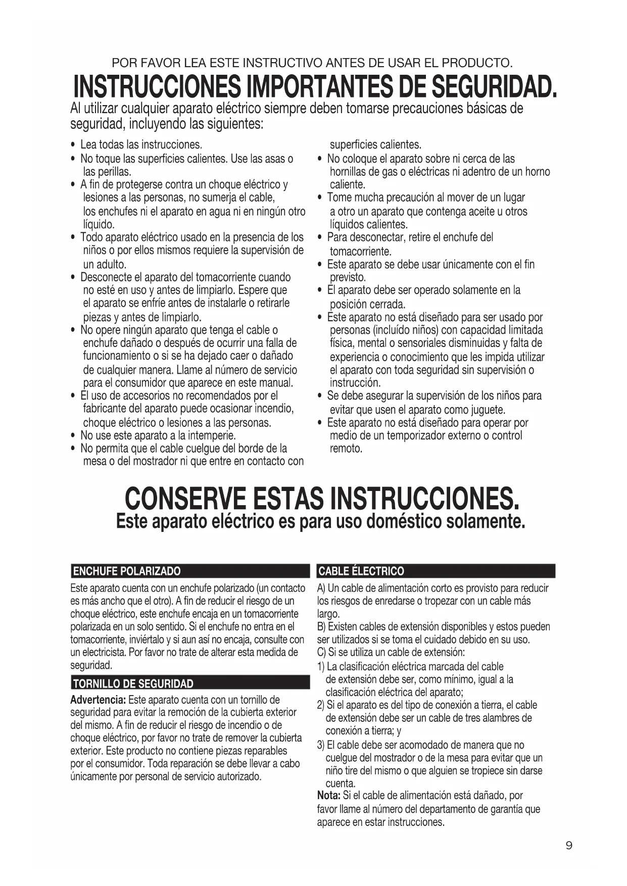 - Este aparato no está diseñado para operar por medio de un temporizador externo o control remoto. POR FAVOR LEA ESTE INSTRUCTIVO ANTES DE USAR EL PRODUCTO. INSTRUCCIONES IMPORTANTES DE SEGURIDAD. Al utilizar cualquier aparato eléctrico siempre deben tomarse precauciones básicas de seguridad, incluyendo las siguientes: CONSERVE ESTAS INSTRUCCIONES. Este aparato eléctrico es para uso doméstico solamente. ENCHUFE POLARIZADO Este aparato cuenta con un enchufe polarizado (un contacto es más ancho que el otro). A n de reducir el riesgo de un choque eléctrico, este enchufe encaja en un tomacorriente polarizada en un solo sentido. Si el enchufe no entra en el tomacorriente, inviértalo y si aun así no encaja, consulte con un electricista. Por favor no trate de alterar esta medida de seguridad.