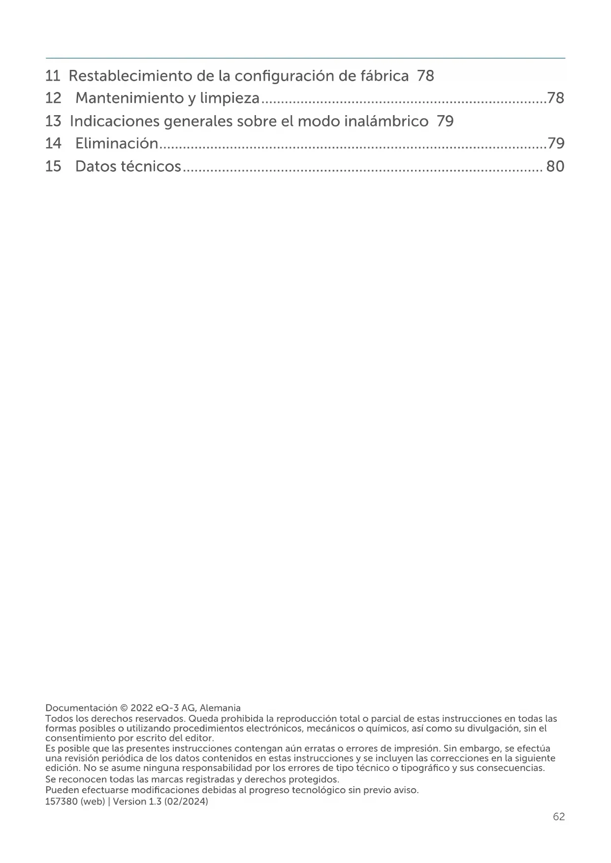 Documentación © 2022 eQ-3 AG, Alemania Todos los derechos reservados. Queda prohibida la reproducción total o parcial de estas instrucciones en todas las formas posibles o utilizando procedimientos electrónicos, mecánicos o químicos, así como su divulgación, sin el consentimiento por escrito del editor. Es posible que las presentes instrucciones contengan aún erratas o errores de impresión. Sin embargo, se efectúa una revisión periódica de los datos contenidos en estas instrucciones y se incluyen las correcciones en la siguiente edición. No se asume ninguna responsabilidad por los errores de tipo técnico o tipográfico y sus consecuencias. Se reconocen todas las marcas registradas y derechos protegidos. Pueden efectuarse modificaciones debidas al progreso tecnológico sin previo aviso. 157380 (web) | Version 1.3 (02/2024) 11 Restablecimiento de la configuración de fábrica 78 12 Mantenimiento y limpieza .........................................................................78 13 Indicaciones generales sobre el modo inalámbrico 79 14 Eliminación ................................................................................................... 79 15 Datos técnicos ............................................................................................ 8063 Volumen de suministro 1 Volumen de suministro