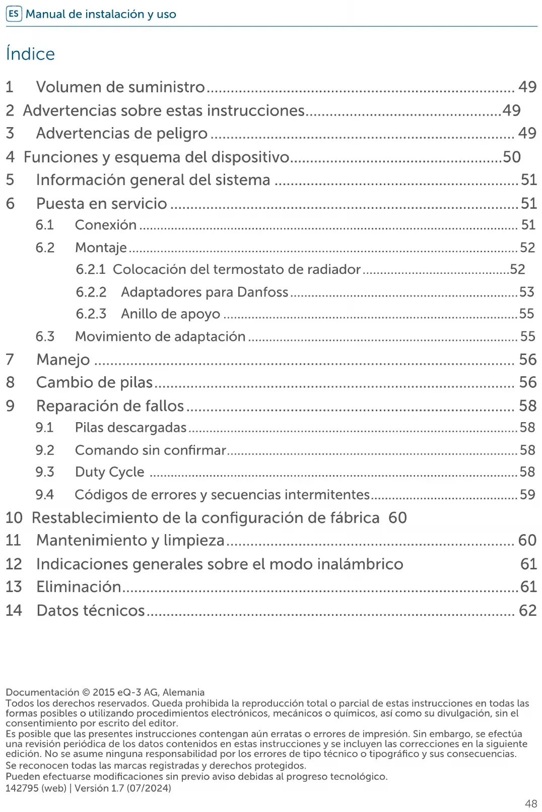 - Suelte de nuevo el botón del siste- ma para finalizar el restablecimien- to de la configuración de fábrica. El dispositivo ejecuta un reinicio. 11 Mantenimiento y limpieza Este dispositivo no requiere man- tenimiento, a excepción de un eventual cambio de pilas. En caso de fallo, encargue su reparación a un técnico. Limpie el dispositivo con un paño sua- ve, limpio, seco y que no deje pelusa. Si está muy sucio, puede limpiarlo con un paño ligeramente humedecido con agua tibia. No utilice productos de lim- pieza que contengan disolventes. Estas sustancias pueden estropear la carcasa de plástico y la rotulación.61 Indicaciones generales sobre el modo inalámbrico 12 Indicaciones generales sobre el modo inalámbrico La transmisión inalámbrica se realiza por una vía de transmisión no exclu- siva, por lo que pueden producirse fallos. También pueden ser fuentes de errores las conmutaciones, motores eléctricos o equipos eléctricos defec- tuosos. El alcance en edificios puede diferir mucho del alcance en campo libre. Aparte de la capaci- dad de transmisión y de las pro- piedades de recepción de los receptores, también desempeñan un papel importante los efectos ambientales, como la humedad o los elementos constructivos del lugar. eQ-3 AG, Maiburger Str. 29, 26789 Leer, Alemania, declara que el tipo de instalación por radio HomematicIP HmIP-eTRV-2, cumple la Directiva 2014/53/UE. El texto de la declaración de conformidad CE está disponible en su integridad en el sitio web: www.homematic-ip.com 13 Eliminación Indicaciones sobre la eliminación Este símbolo significa que el dis- positivo y las pilas o acumuladores no deben desecharse con la basu- ra doméstica, en el contenedor de residuos ni en el contenedor amarillo o el saco amarillo. Con el fin de proteger la salud y el medio ambiente, está obligado a en- tregar el producto, todas las piezas electrónicas incluidas en el volumen de suministro y las pilas para su correcta eliminación en un punto de recogida de residuos municipal para aparatos eléctricos y electrónicos usados o para pilas usadas. Los distribuidores de apa- ratos eléctricos y electrónicos o pilas también están obligados a la recogida gratuita de dispositivos usados o pilas usadas. Mediante la recogida por separado, contribuye significativamente a la re- utilización, el reciclado y otras formas de recuperación de dispositivos usados y pilas usadas. Está obligado a retirar del dispositivo usado las pilas usadas y acumuladores usados que no estén integrados en los dispositivos eléctricos y electrónicos, antes de entregar el dispositivo usa- do en el punto de recuperación, y a desecharlos por separado a través del punto de recogida local. Le advertimos expresamente sobre el hecho de que usted, como usuario final, es responsable de eliminar los datos personales de los aparatos eléc- tricos y electrónicos usados que se van a desechar. Información relativa a la conformidad El distintivo CE es un símbolo de mercado libre dirigido exclusiva- mente a las autoridades y que no implica ninguna garantía de de- terminadas características. Si tiene consultas técnicas sobre el dispositivo, contacte con su proveedor.62 Datos técnicos 14 Datos técnicos Nombre abreviado del dispositivo: HmIP-eTRV-2 Tensión de alimentación: 2 pilas LR6/Mignon/AA, 1,5 V Consumo de corriente: máx. 120 mA Duración de las pilas: 2 años (típ.) Tipo de protección: IP20 Grado de suciedad: 2 Temperatura ambiente: de 0 a 50 °C Dimensiones (A x H x P): 58 x 71 x 97 mm Peso: 205g (incl. pilas) Banda de radiofrecuencia: 868,0-868,6MHz 869,4-869,65MHz Potencia de radioemisión máxima: 10dBm Categoría de receptor: SRD category 2 Alcance típ. en campo abierto: 300m Duty Cycle: < 1 % por h/< 10 % por h Construcción del dispositivo de control y seguridad (RS): Dispositivo de control y seg. electróni- co montado independientemente Modo de funcionamiento: tipo 1 Conexión: M30 x 1,5 mm Salvo modificaciones técnicas.63 Documentazione © 2015 eQ-3 AG, Germania Tutti i diritti riservati. Senza l’approvazione scritta del produttore è vietata la riproduzione di questo manuale o di sue parti in qualsiasi forma o la sua duplicazione o modifica con l’utilizzo di processi elettronici, meccanici o chimici.Questo manuale potrebbe presentare difetti dovuti alla tecnica di stampa o errori di stampa. Le informazioni qui contenute sono comunque costantemente verificate e le eventuali correzioni sono rese note nell'edizione successi-va. Si declina qualsiasi responsabilità per errori di tipo tecnico o di stampa e per le loro conseguenze.Si riconoscono tutti i marchi depositati e i diritti di proprietà.Non si escludono modifiche apportate senza preavviso conformemente agli sviluppi tecnici.142795 (web) | Versione 1.7 (07/2024) Indice 1 Fornitura ...................................................................................................... 64 2 Indicazioni su queste istruzioni ............................................................... 64 3 Indicazioni di pericolo............................................................................... 64 4 Funzioni e vista d’insieme dell’apparecchio 65 5 Informazioni generali sul sistema ........................................................... 66 6 Messa in funzione ...................................................................................... 66