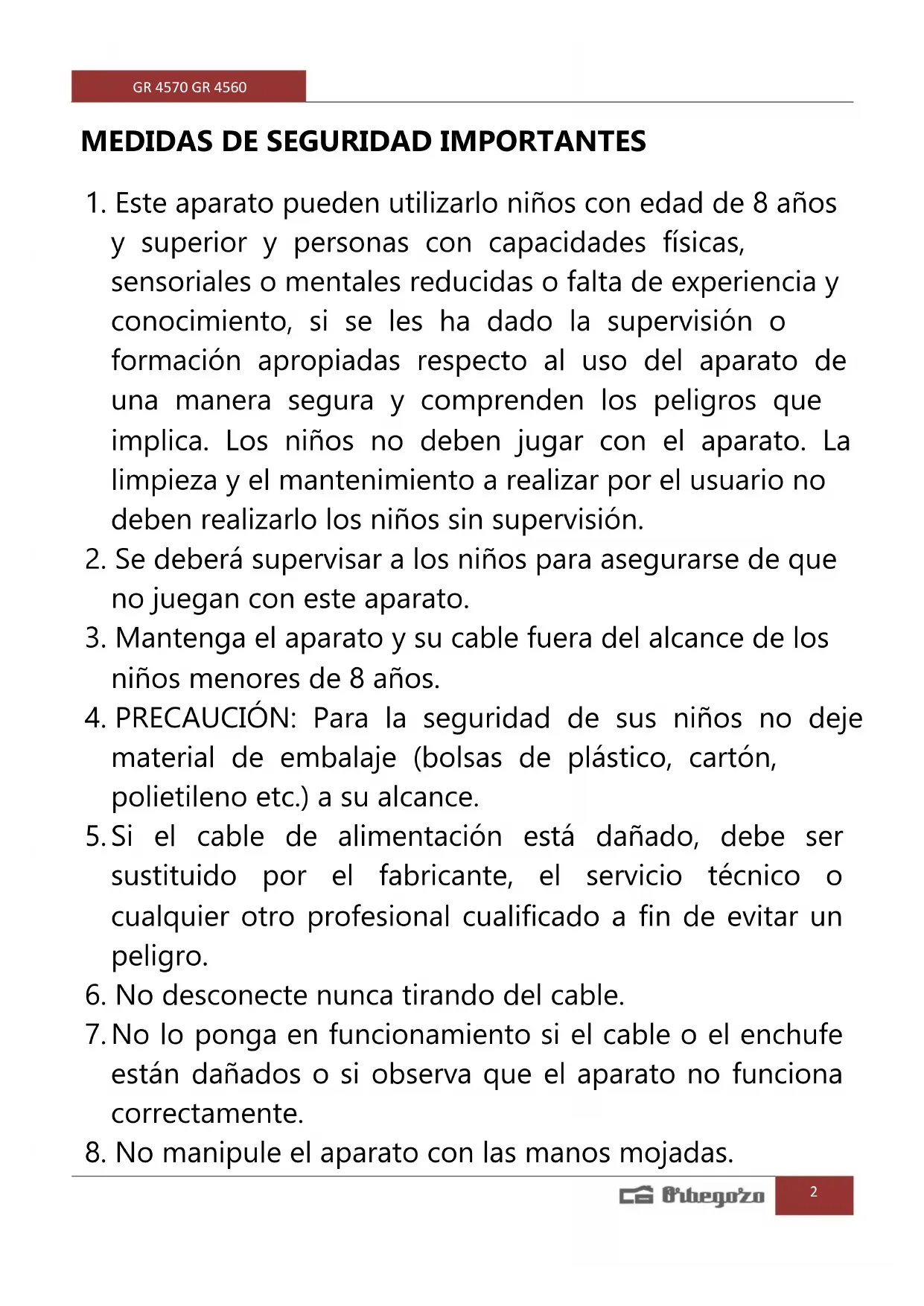 8. No manipule el aparato con las manos mojadas.GR 4570 GR 4560
