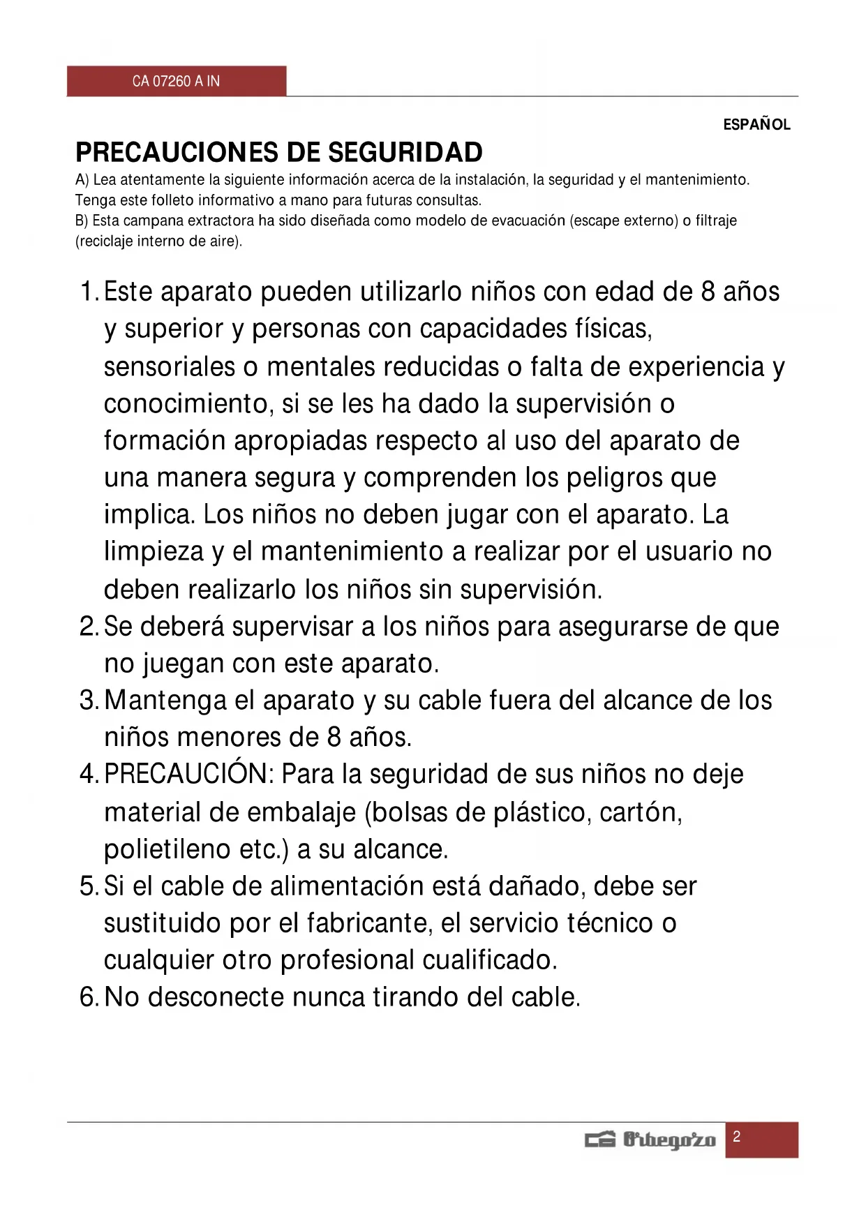 MANUAL DE USUARIO CA 07260 Orbegozo