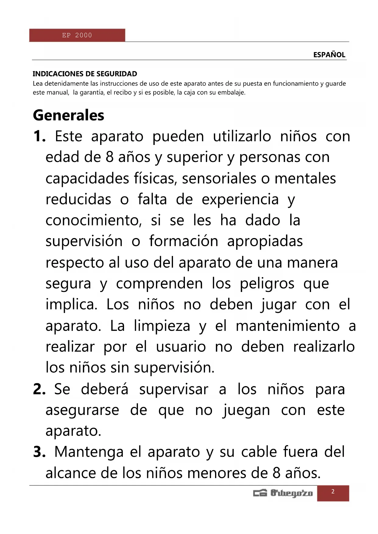 MANUAL DE USUARIO EP 2000 Orbegozo