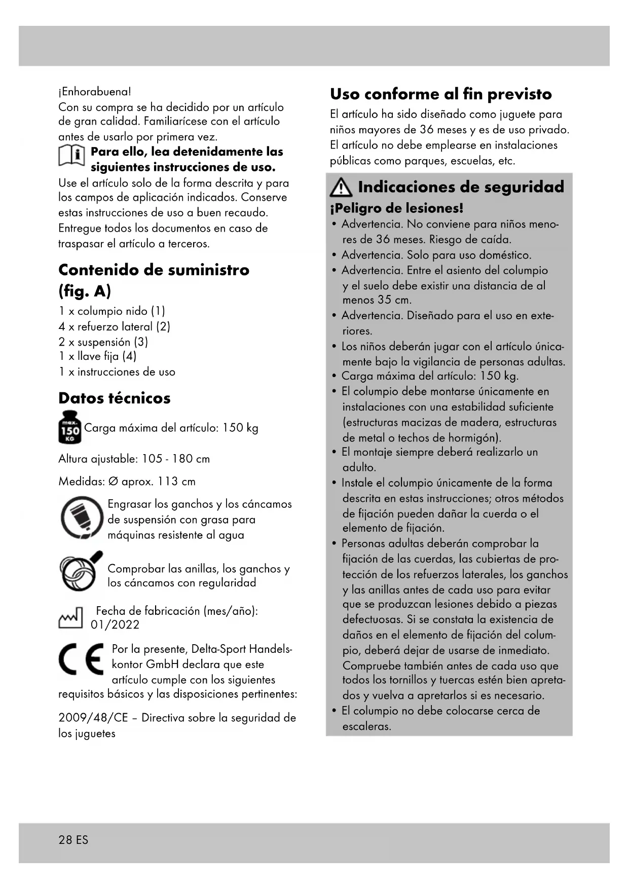 te (fig. C). Fije el columpio únicamente a instalaciones en las que esté seguro de que se puede garantizar con total seguridad una fijación suficiente. Para el montaje emplee ganchos para columpios de venta en comercios con un espesor mín. de 10 mm y función de seguridad para prevenir que se afloje accidentalmente. En vigas de madera, la fijación debe atravesar la madera por completo y asegurarse con contratuerca por la parte su- perior para conseguir una unión suficientemente segura. Diferentes ganchos de fijación Fije el balanceador únicamente a soportes adecuados. Estos son: Nº 1: ojetes de fijación cerrados en los que el balanceador se fija usando un mosquetón (fig. D). Nº 2: ganchos para columpios de venta en comercios con función de seguridad para evitar que se aflojen accidentalmente (fig. E). ¡Nota! El orificio de los ojetes de fijación (1) debe colocarse transversalmente a la dirección de balanceo para que el elemento de fijación del columpio no sufra un desgaste excesivo durante el uso.30 ES Ajuste de la altura del balan- ceador La altura del asiento puede ajustarse empleando la anilla del extremo superior del columpio. Una vez ajustada la longitud de la cuerda, vuelva a apretarla firmemente con carga (fig. F). Ajuste la longitud a ambos lados de forma que el columpio se encuentre completamente horizontal. Mantenimiento (fig. G) Compruebe con regularidad que las anillas, los ganchos y los cáncamos del artículo se encuentran en perfecto estado y engrase las anillas de suspensión del artículo y los ganchos de suspensión, a proporcionar por el cliente, periódicamente con grasa para máquinas resis- tente al agua de venta habitual en comercios. De forma alternativa puede emplear también grasa adhesiva. Almacenamiento, limpieza Si no va a utilizarlo, almacene siempre el artícu- lo seco y limpio y a temperatura ambiente. Limpie solo con agua y después seque con un paño de limpieza. ¡IMPORTANTE! No lo limpie con productos de limpieza agresivos. Indicaciones para la elimina- ción Elimine el artículo y el material de embalaje conforme a la normativa legal local en la ac- tualidad. No deje material de embalaje, como bolsas de plástico, en manos de niños. Guarde el material de embalaje en un lugar inaccesible para éstos. Deseche los productos y embalajes de manera respetuosa con el medio ambiente. El código de reciclaje sirve para identificar diversos materiales para reincorporarlos en el ciclo de reciclaje. El código consta del símbolo de reciclaje, el cual debe reflejar el ciclo de recuperación, y de un número que identifica el material. Indicaciones relativas a la garantía y la gestión de servicios El artículo ha sido fabricado con gran esmero y sometido a controles constantes. Para el mismo, DELTA-SPORT HANDELSKONTOR GmbH ofrece a los clientes finales particulares una garantía de tres años a contar desde la fecha de compra (periodo de garantía) con arreglo a las condiciones que se exponen a continuación. La garantía tiene validez únicamente para fallos del material y fabricación. La garantía no cubre las piezas sometidas a un desgaste normal, las cuales se consideran piezas de desgaste (p. ej., pilas) así como tampoco piezas frágiles como, p. ej., interruptores, baterías o piezas fabricadas en vidrio o cristal. Se excluyen derechos derivados de esta garantía, si se ha realizado un uso incorrecto o abusivo del artículo o que no se encuentre dentro del marco del uso o ámbito de uso previs- tos o si no se ha observado lo recogido en el manual de instrucciones, a no ser que el cliente final demuestre que existen fallos del material o fabricación no derivados de una de las circuns- tancias expuestas anteriormente. Las demandas derivadas de la garantía sólo podrán presentarse dentro del periodo de garantía exhibiendo el comprobante de compra original. Le rogamos, por ello, que conserve el comprobante de compra original. El periodo de garantía no se verá prolongado por ningún tipo de reparación realizada con motivo de la ga- rantía, la garantía legal o como gesto de buena voluntad. Esto se aplica también a las piezas sustituidas o reparadas.31ES Por favor, dirija sus quejas primero a la línea telefónica del servicio de atención al cliente que se indica a continuación o póngase en contacto con nosotros por correo electrónico. Si el caso está cubierto por la garantía, a nuestra elección, repararemos o cambiaremos gratuitamente el artículo o le restituiremos el precio de compra del mismo. De la garantía no se derivan otros derechos. Esta garantía no limitará sus derechos legales, especialmente los derechos de garantía frente al vendedor correspondiente. IAN: 384896_2107 Servicio España Tel.: 900 984 989 E-Mail: deltasport@lidl.es32 Forskriftsmæssig anvendelse Produktet er designet til privat anvendelse som legetøj til børn over 36 måneder. Produktet må ikke anvendes i offentlige anlæg som legeplad- ser, i skoler etc. Sikkerhedsanvisninger Risiko for kvæstelse!