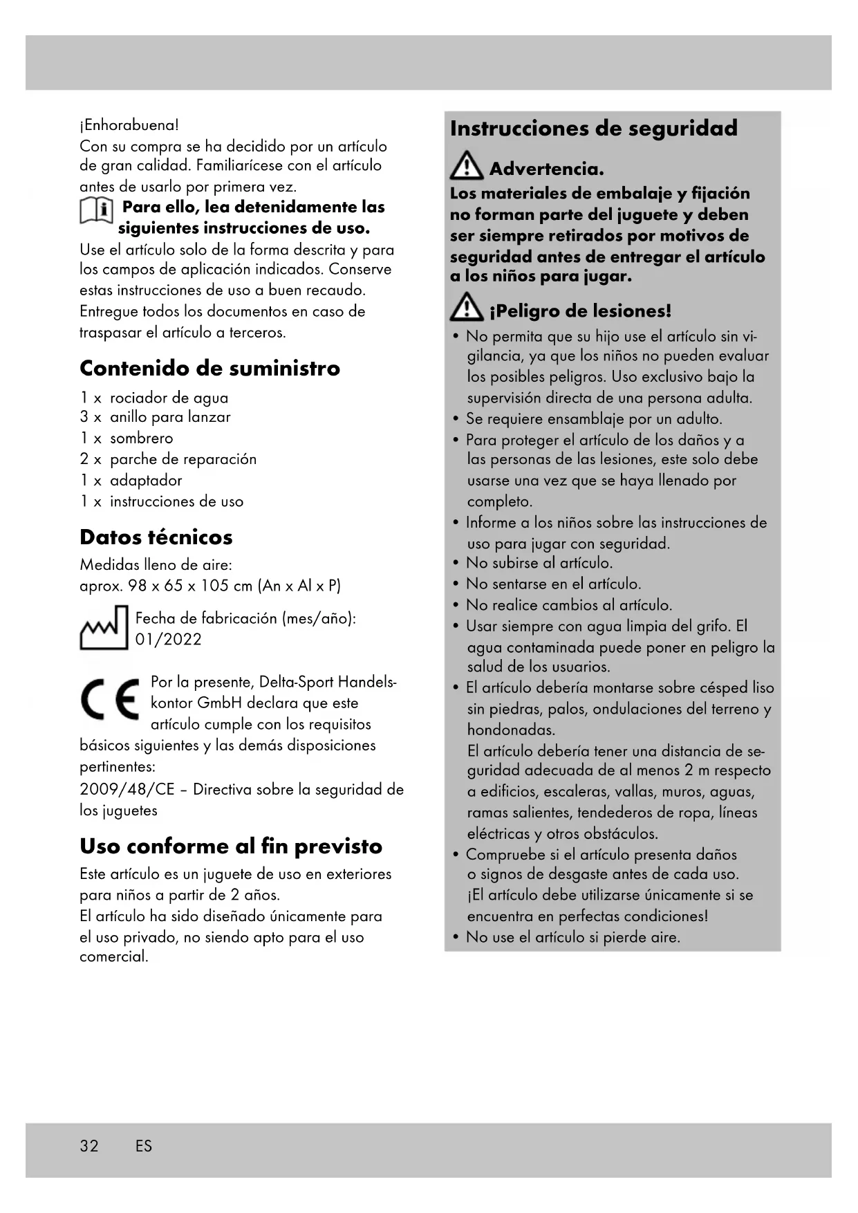 el área dañada y péguelo presionándolo con firmeza. Almacenamiento, limpieza Si no va a utilizarlo, almacene siempre el artí- culo desinflado, seco y limpio y a temperatura ambiente. Las válvulas deben permanecer cerra- das durante todo el tiempo de almacenamiento. Limpiarlo sólo con agua o agua jabonosa, no emplear nunca detergentes agresivos. Al alma- cenar el artículo para el invierno, no colocar objetos afilados sobre el mismo ni espolvorearlo con talco. Indicaciones para la eliminación Elimine el artículo y el material de embalaje conforme a la normativa legal local en la ac- tualidad. No deje material de embalaje, como bolsas de plástico, en manos de niños. Guarde el material de embalaje en un lugar inaccesible para éstos. Deseche los productos y embalajes de manera respetuosa con el medio ambiente. El código de reciclaje sirve para identificar diversos materiales para reincorporarlos en el ciclo de reciclaje. El código consta del símbolo de reciclaje, el cual debe reflejar el ciclo de recuperación, y de un número que identifica el material. Indicaciones relativas a la garantía y la gestión de ser- vicios El artículo ha sido fabricado con gran esmero y sometido a controles constantes. Para el mismo, DELTA-SPORT HANDELSKONTOR GmbH ofrece a los clientes finales particulares una garantía de tres años a contar desde la fecha de compra (periodo de garantía) con arreglo a las condiciones que se exponen a continuación. ES35ES La garantía tiene validez únicamente para fallos del material y fabricación. La garantía no cubre las piezas sometidas a un desgaste normal, las cuales se consideran piezas de desgaste (p. ej., pilas) así como tampoco piezas frágiles como, p. ej., interruptores, baterías o piezas fabricadas en vidrio o cristal. Se excluyen derechos derivados de esta garantía, si se ha realizado un uso incorrecto o abusivo del artículo o que no se encuentre dentro del marco del uso o ámbito de uso previs- tos o si no se ha observado lo recogido en el manual de instrucciones, a no ser que el cliente final demuestre que existen fallos del material o fabricación no derivados de una de las circuns- tancias expuestas anteriormente. Las demandas derivadas de la garantía sólo podrán presentarse dentro del periodo de garantía exhibiendo el comprobante de compra original. Le rogamos, por ello, que conserve el comprobante de compra original. El periodo de garantía no se verá prolongado por ningún tipo de reparación realizada con motivo de la garantía, la garantía legal o como gesto de buena voluntad. Esto se aplica también a las piezas sustituidas o reparadas. Por favor, dirija sus quejas primero a la línea telefónica del servicio de atención al cliente que se indica a continuación o póngase en contacto con nosotros por correo electrónico. Si el caso está cubierto por la garantía, a nuestra elección, repararemos o cambiaremos gratuitamente el artículo o le restituiremos el precio de compra del mismo. De la garantía no se derivan otros derechos. Esta garantía no limitará sus derechos legales, especialmente los derechos de garantía frente al vendedor correspondiente. IAN: 398788_2107 Servicio España Tel.: 900 984 989 E-Mail: deltasport@lidl.es36 Hjertelig tillykke! Du har valgt at købe et kvalitetsprodukt. Lær produktet at kende, inden du bruger det første gang. Det gør du ved at læse nedenståen- de brugervejledning omhyggeligt. Brug kun produktet som beskrevet og til de angivne anvendelsesområder. Opbevar denne brugervejledning et sikkert sted. Udlever også alle dokumenter, hvis produktet videregives til en tredjepart. Leveringsomfang 1 x vandsprinkler 3 x kastering 1 x hætte 2 x reparationslap 1 x adapter 1 x brugervejledning Tekniske data Mål, luftfyldt: ca. 98 x 65 x 105 cm (B x H x D) Fremstillingsdato (måned/år): 01/2022 Hermed erklærer Delta-Sport Handelskontor GmbH, at denne artikel overholder følgende, grund- læggende krav og de øvrige relevante bestemmelser: 2009/48/EU – Legetøjsdirektivet Tilsigtet brug Denne artikel er legetøj til børn fra 2-års alderen til udendørs brug. Artiklen er kun beregnet til privat brug og ikke til kommerciel brug. Sikkerhedsoplysninger Advarsel. Alle emballage- og monteringsmateri- aler er ikke en del af legetøjet og skal altid fjernes af sikkerhedsmæssige grunde, inden artiklen udleveres til børn at lege med. Fare for skader!