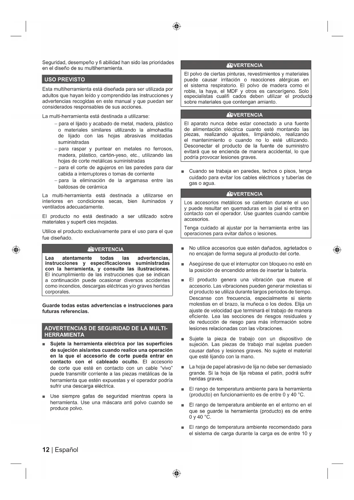 ELSeguridad, desempeño y fi abilidad han sido las prioridades en el diseño de su multiherramienta. USO PREVISTO Esta multiherramienta está diseñada para ser utilizada por adultos que hayan leído y comprendido las instrucciones y advertencias recogidas en este manual y que puedan ser considerados responsables de sus acciones. La multi-herramienta está destinada a utilizarse: – para el lijado y acabado de metal, madera, plástico o materiales similares utilizando la almohadilla de lijado con las hojas abrasivas moldadas suministradas – para raspar y puntear en metales no ferrosos, madera, plástico, cartón-yeso, etc., utilizando las hojas de corte metálicas suministradas – para el corte de agujeros en las paredes para dar cabida a interruptores o tomas de corriente – para la eliminación de la argamasa entre las baldosas de cerámica La multi-herramienta está destinada a utilizarse en interiores en condiciones secas, bien iluminados y ventilados adecuadamente. El producto no está destinado a ser utilizado sobre materiales y superfi cies mojadas. Utilice el producto exclusivamente para el uso para el que fue diseñado. ADVERTENCIA Lea atentamente todas las advertencias, instrucciones y especificaciones suministradas con la herramienta, y consulte las ilustraciones. El incumplimiento de las instrucciones que se indican a continuación puede ocasionar diversos accidentes como incendios, descargas eléctricas y/o graves heridas corporales. Guarde todas estas advertencias e instrucciones para futuras referencias.