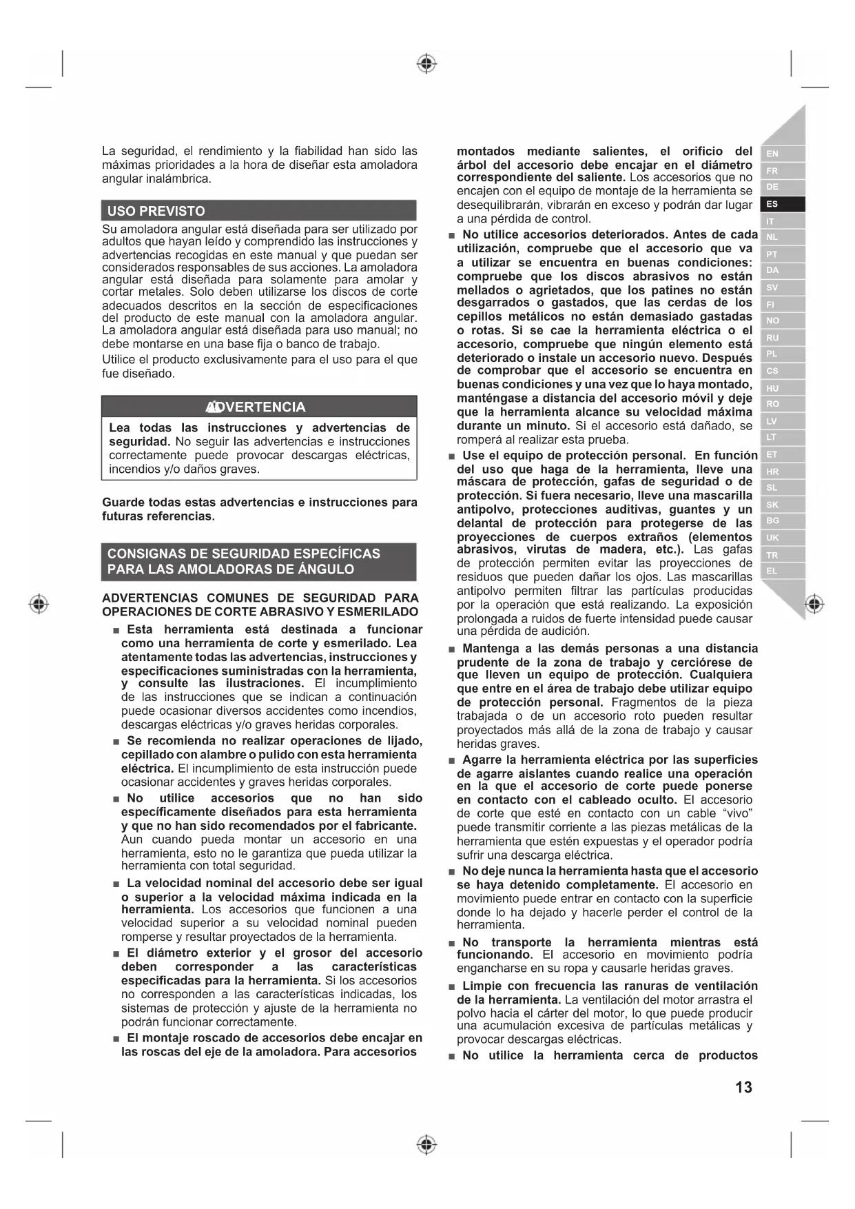 La seguridad, el rendimiento y la fiabilidad han sido las máximas prioridades a la hora de diseñar esta amoladora angular inalámbrica. USO PREVISTO Su amoladora angular está diseñada para ser utilizado por adultos que hayan leído y comprendido las instrucciones y advertencias recogidas en este manual y que puedan ser considerados responsables de sus acciones. La amoladora angular está diseñada para solamente para amolar y cortar metales. Solo deben utilizarse los discos de corte adecuados descritos en la sección de especificaciones del producto de este manual con la amoladora angular. La amoladora angular está diseñada para uso manual; no debe montarse en una base fija o banco de trabajo. Utilice el producto exclusivamente para el uso para el que fue diseñado. ADVERTENCIA Lea todas las instrucciones y advertencias de seguridad. No seguir las advertencias e instrucciones correctamente puede provocar descargas eléctricas, incendios y/o daños graves. Guarde todas estas advertencias e instrucciones para futuras referencias.