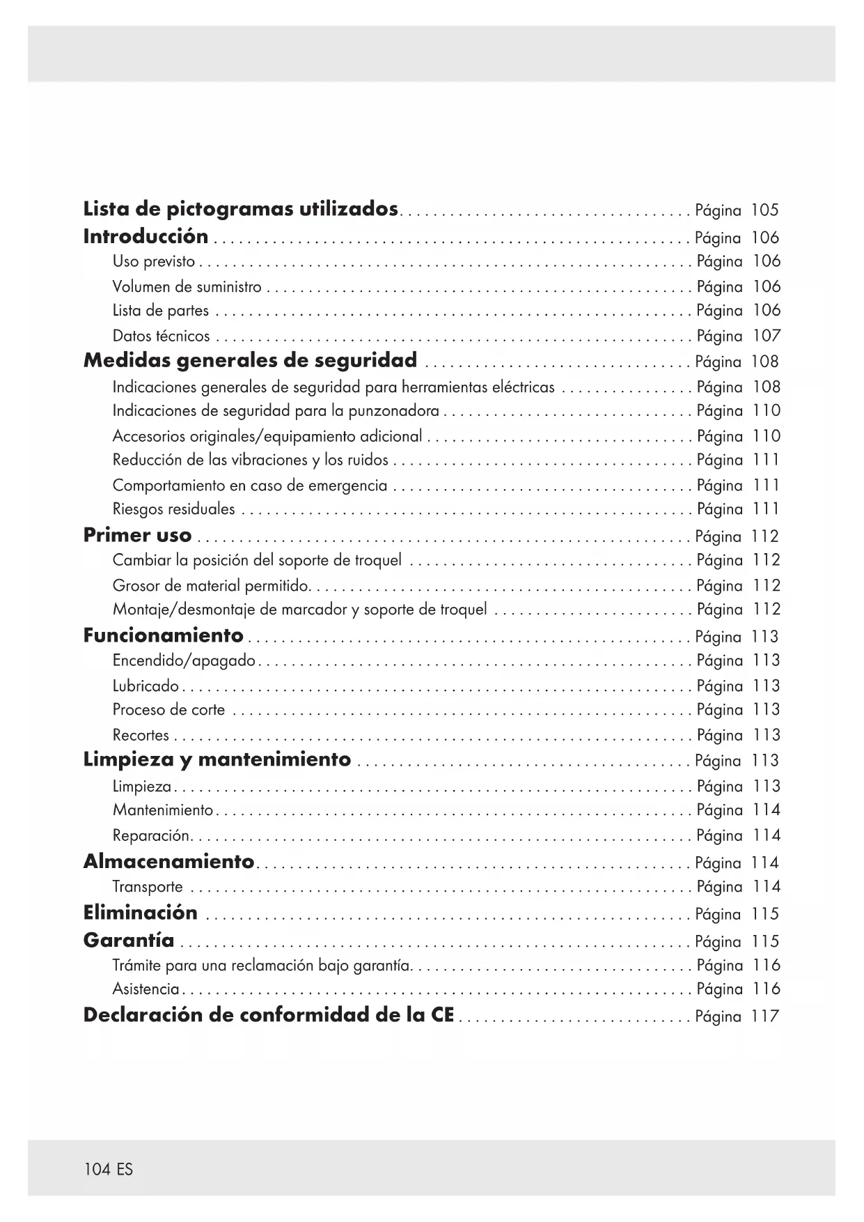 Lista de pictogramas utilizados................................... Página 105 Introducción ......................................................... Página 106 Uso previsto ........................................................... Página 106 Volumen de suministro ................................................... Página 106 Lista de partes ......................................................... Página 106 Datos técnicos ......................................................... Página 107 Medidas generales de seguridad ................................ Página 108 Indicaciones generales de seguridad para herramientas eléctricas ................ Página 108 Indicaciones de seguridad para la punzonadora .............................. Página 110 Accesorios originales/equipamiento adicional ................................ Página 110 Reducción de las vibraciones y los ruidos . . . . . . . . . . . . . . . . . . . . . . . . . . . . . . . . . . . . Página 111 Comportamiento en caso de emergencia .................................... Página 111 Riesgos residuales ...................................................... Página 111 Primer uso ........................................................... Página 112 Cambiar la posición del soporte de troquel .................................. Página 112 Grosor de material permitido.............................................. Página 112 Montaje/desmontaje de marcador y soporte de troquel ........................ Página 112 Funcionamiento ..................................................... Página 113 Encendido/apagado.................................................... Página 113 Lubricado ............................................................. Página 113 Proceso de corte ....................................................... Página 113 Recortes .............................................................. Página 113 Limpieza y mantenimiento ........................................ Página 113 Limpieza.............................................................. Página 113 Mantenimiento......................................................... Página 114 Reparación............................................................ Página 114 Almacenamiento.................................................... Página 114 Transporte ............................................................ Página 114 Eliminación .......................................................... Página 115 Garantía ............................................................. Página 115 Trámite para una reclamación bajo garantía.................................. Página 116 Asistencia............................................................. Página 116 Declaración de conformidad de la CE ............................ Página 117105