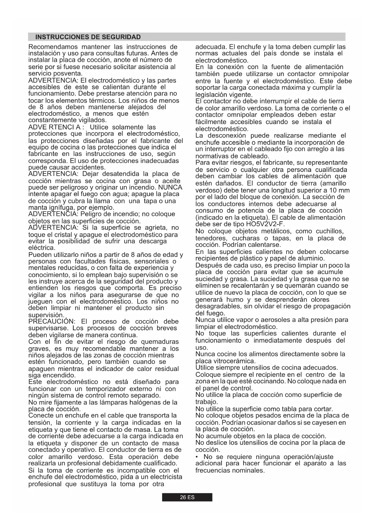 adecuada. El enchufe y la toma deben cumplir las normas actuales del país donde se instala el electrodoméstico. En la conexión con la fuente de alimentación también puede utilizarse un contactor omnipolar entre la fuente y el electrodoméstico. Este debe soportar la carga conectada máxima y cumplir la legislación vigente. El contactor no debe interrumpir el cable de tierra de color amarillo verdoso. La toma de corriente o el contactor omnipolar empleados deben estar fácilmente accesibles cuando se instala el electrodoméstico. La desconexión puede realizarse mediante el enchufe accesible o mediante la incorporación de un interruptor en el cableado fijo con arreglo a las normativas de cableado. Para evitar riesgos, el fabricante, su representante de servicio o cualquier otra persona cualificada deben cambiar los cables de alimentación que estén dañados. El conductor de tierra (amarillo verdoso) debe tener una longitud superior a 10 mm por el lado del bloque de conexión. La sección de los conductores internos debe adecuarse al consumo de potencia de la placa de cocción (indicado en la etiqueta). El cable de alimentación debe ser de tipo HO5V2V2-F. No coloque objetos metálicos, como cuchillos, tenedores, cucharas o tapas, en la placa de cocción. Podrían calentarse. En las superficies calientes no deben colocarse recipientes de plástico y papel de aluminio. Después de cada uso, es preciso limpiar un poco la placa de cocción para evitar que se acumule suciedad y grasa. La suciedad y la grasa que no se eliminen se recalentarán y se quemarán cuando se utilice de nuevo la placa de cocción, con lo que se generará humo y se desprenderán olores desagradables, sin olvidar el riesgo de propagación del fuego. Nunca utilice vapor o aerosoles a alta presión para limpiar el electrodoméstico. No toque las superficies calientes durante el funcionamiento o inmediatamente después del uso. Nunca cocine los alimentos directamente sobre la placa vitrocerámica. Utilice siempre utensilios de cocina adecuados. Coloque siempre el recipiente en el centro de la zona en la que esté cocinando. No coloque nada en el panel de control. No utilice la placa de cocción como superficie de trabajo. No utilice la superficie como tabla para cortar. No coloque objetos pesados encima de la placa de cocción. Podrían ocasionar daños si se cayesen en la placa de cocción. No acumule objetos en la placa de cocción. No deslice los utensilios de cocina por la placa de cocción.