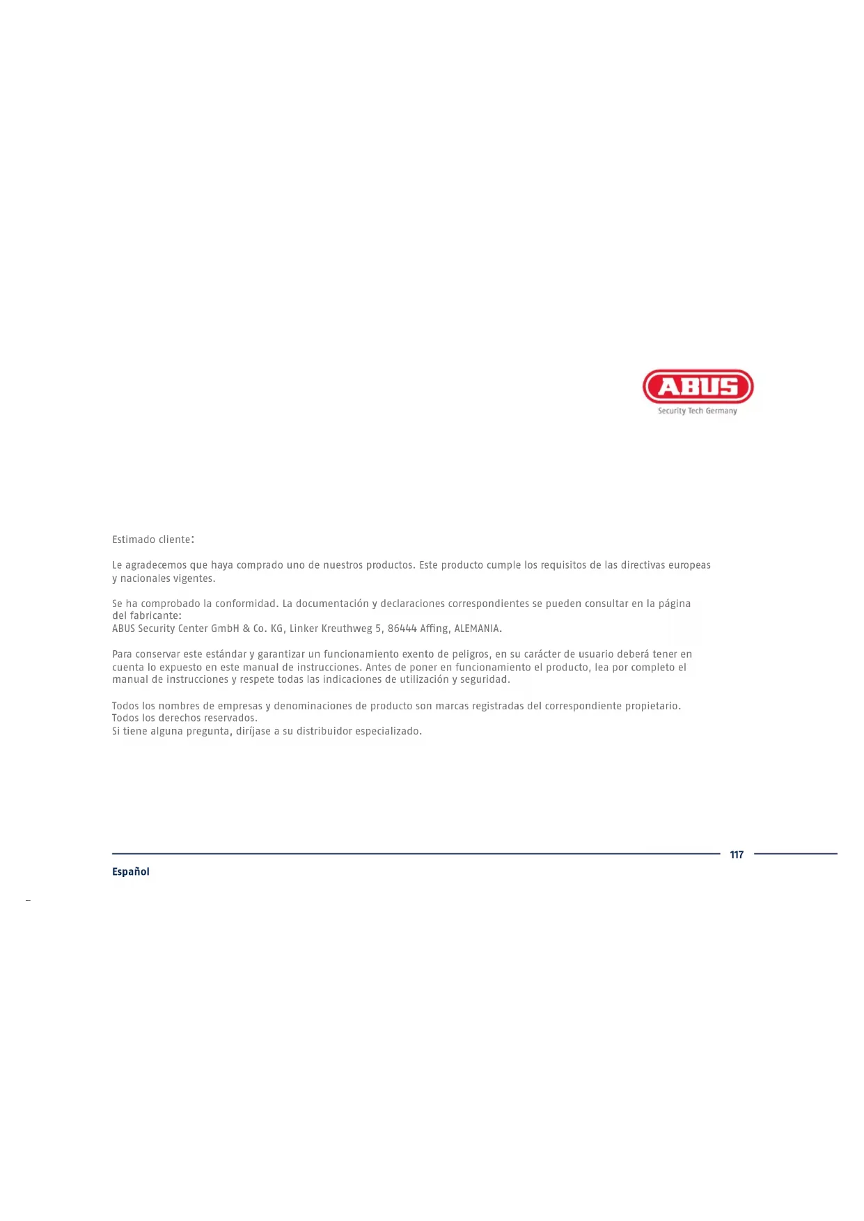 En esta guía rápida se describen los primeros pasos para instalar su grabadora analógica de alta denición. Encontrará información detallada en el manual de instrucciones disponible en la página web abus.com.117 Español Estimado cliente: Le agradecemos que haya comprado uno de nuestros productos. Este producto cumple los requisitos de las directivas europeas y nacionales vigentes. Se ha comprobado la conformidad. La documentación y declaraciones correspondientes se pueden consultar en la página del fabricante: ABUS Security Center GmbH & Co. KG, Linker Kreuthweg 5, 86444 Ang, ALEMANIA. Para conservar este estándar y garantizar un funcionamiento exento de peligros, en su carácter de usuario deberá tener en cuenta lo expuesto en este manual de instrucciones. Antes de poner en funcionamiento el producto, lea por completo el manual de instrucciones y respete todas las indicaciones de utilización y seguridad. Todos los nombres de empresas y denominaciones de producto son marcas registradas del correspondiente propietario. Todos los derechos reservados. Si tiene alguna pregunta, diríjase a su distribuidor especializado.118 Español