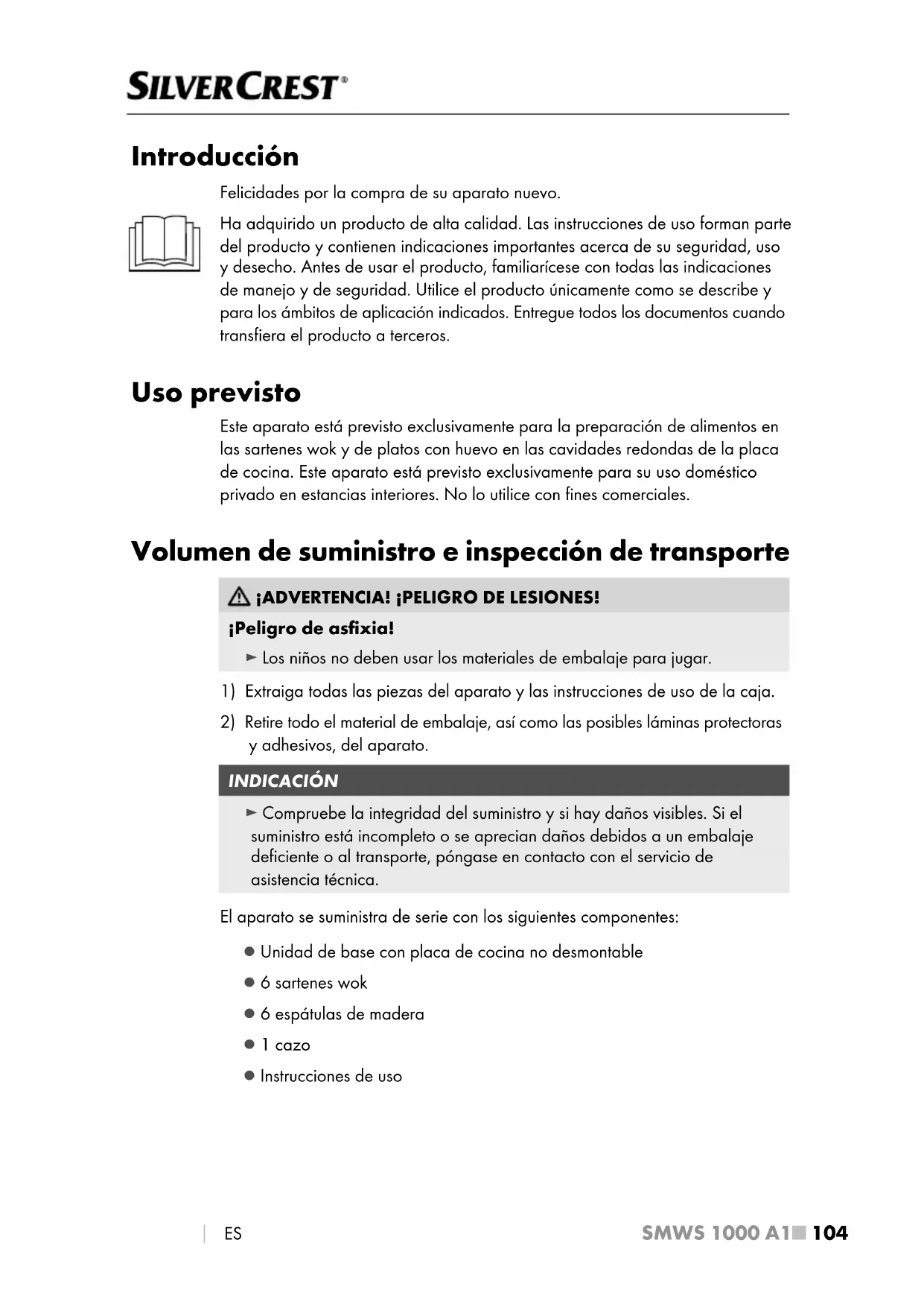 ES Introducción Felicidades por la compra de su aparato nuevo. Ha adquirido un producto de alta calidad. Las instrucciones de uso forman parte del producto y contienen indicaciones importantes acerca de su seguridad, uso y desecho. Antes de usar el producto, familiarícese con todas las indicaciones de manejo y de seguridad. Utilice el producto únicamente como se describe y para los ámbitos de aplicación indicados. Entregue todos los documentos cuando transfiera el producto a terceros. Uso previsto Este aparato está previsto exclusivamente para la preparación de alimentos en las sartenes wok y de platos con huevo en las cavidades redondas de la placa de cocina. Este aparato está previsto exclusivamente para su uso doméstico privado en estancias interiores. No lo utilice con fines comerciales. Volumen de suministro e inspección de transporte ¡ADVERTENCIA! ¡PELIGRO DE LESIONES! ¡Peligro de asfixia! ► Los niños no deben usar los materiales de embalaje para jugar.